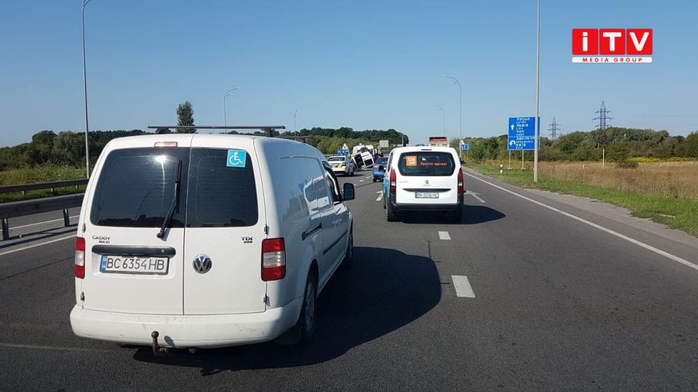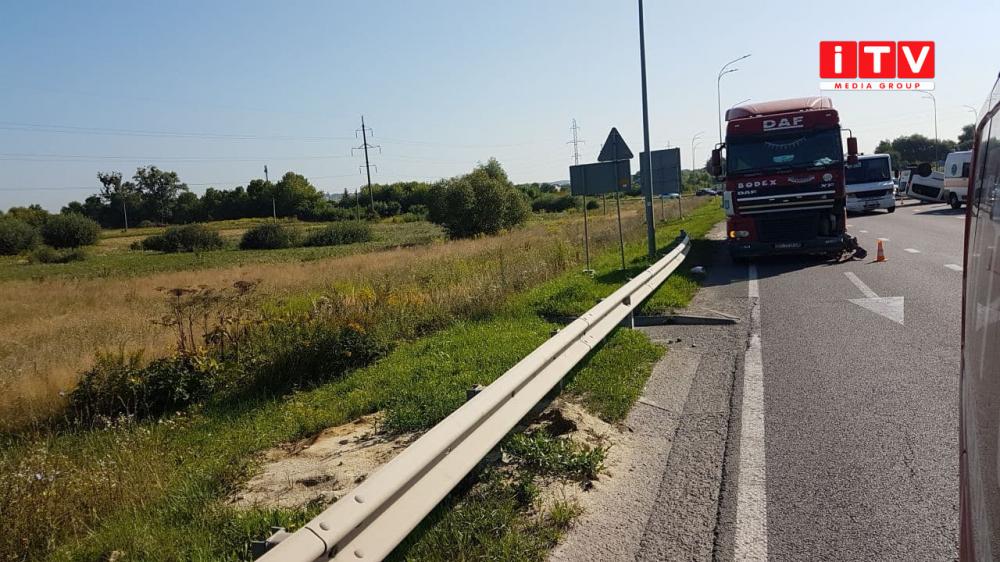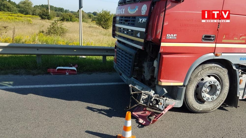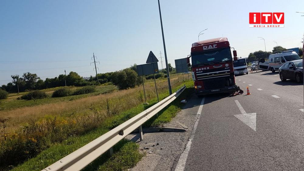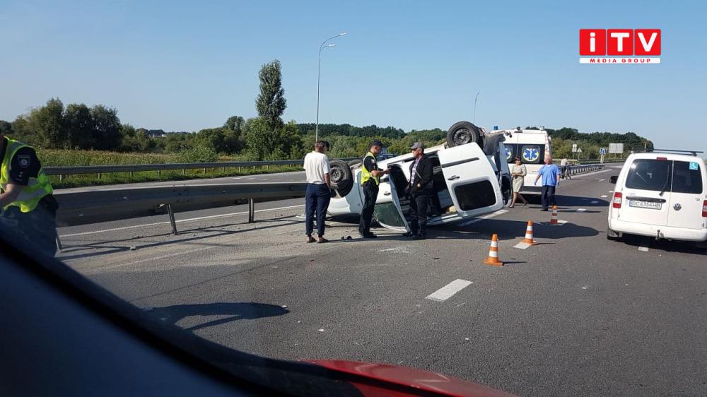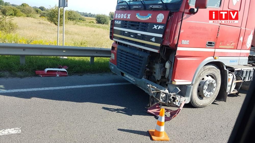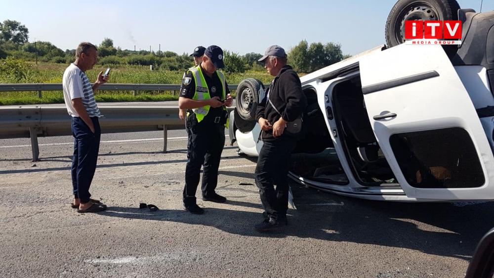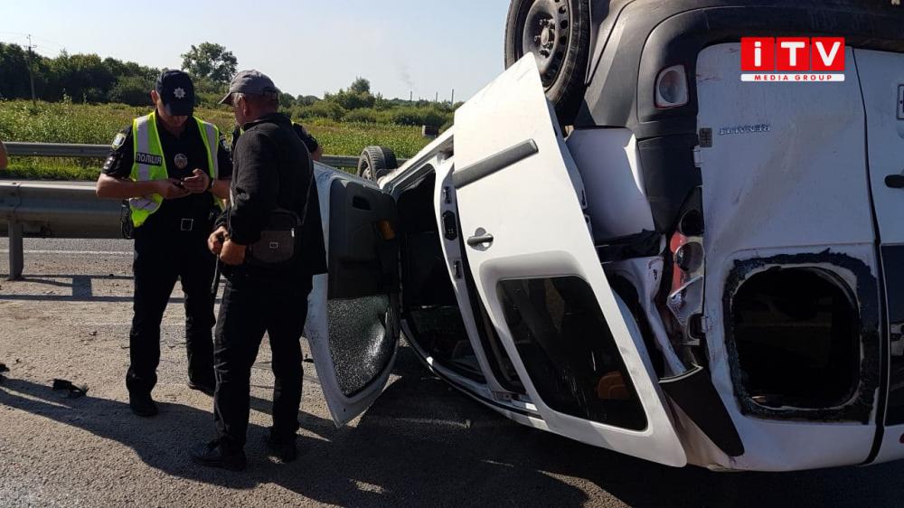 Аварія сталась близько 9:30. Зіткнулись багатотонник та легковик. Останній транспортний засіб відкинуло у відбійник. Від удару він перекинувся на дах.