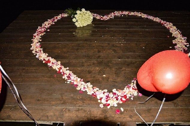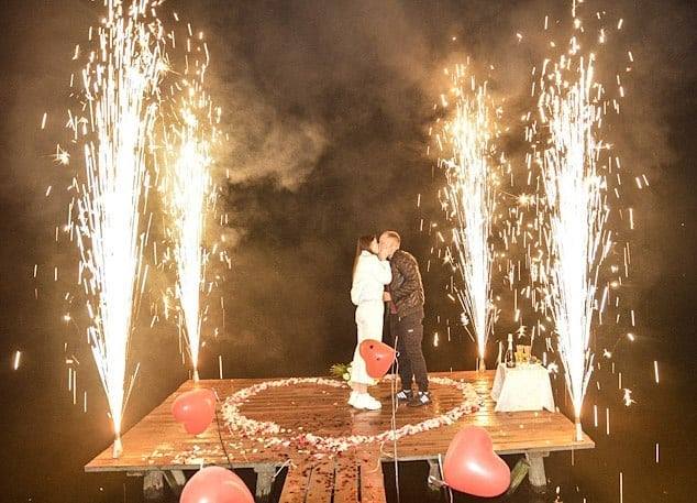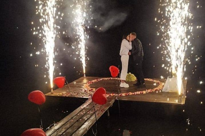 На фото видно, що хлопець виклав серце пелюстками троянд. У результаті біля озера були феєрверки та поцілунки закоханої пари.