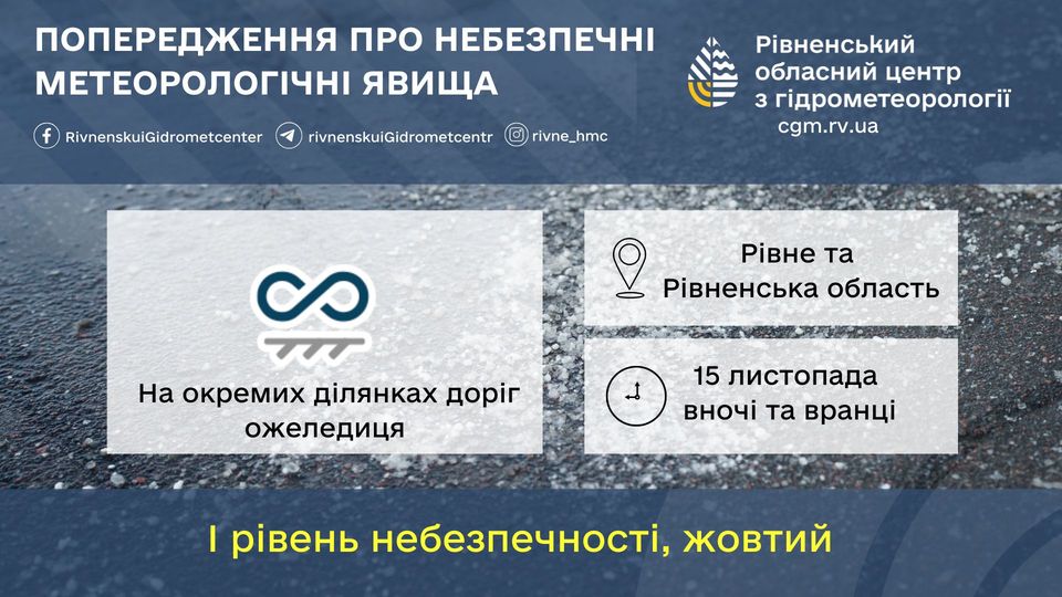 15 листопада вночі та вранці у Рівному та області на окремих ділянках доріг очікується ожеледиця.