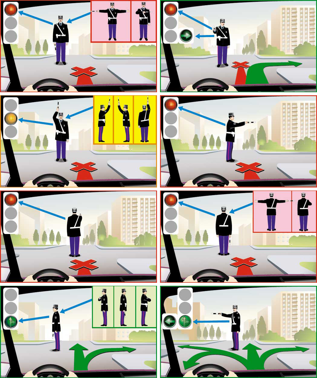 5 і 6. Регулювальник дорожнього руху стоїть спиною до вас. Руки його можуть перебувати в різних позиціях.