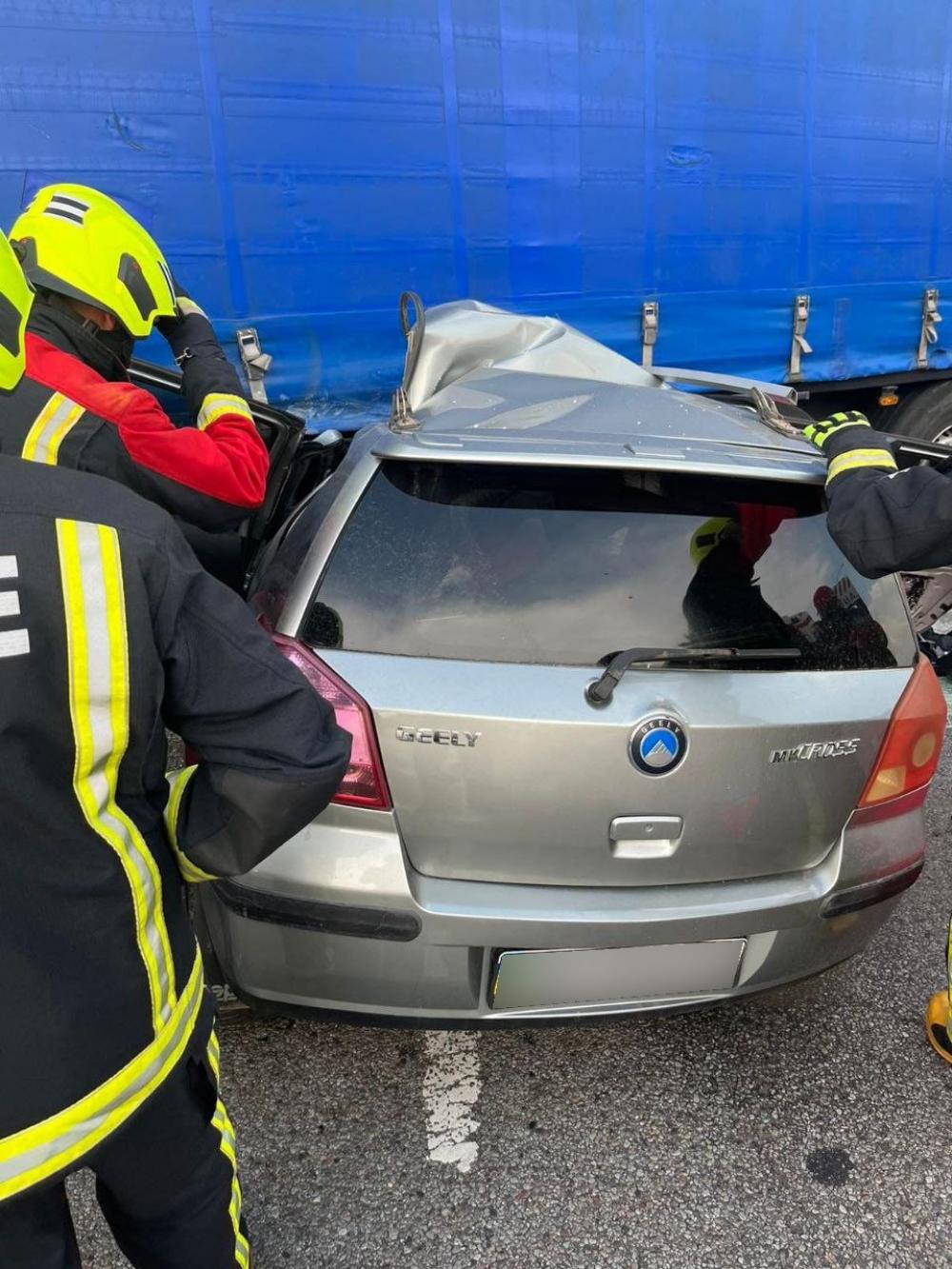 Прибувши на місце ДТП бійці ДСНС побачили, що легковий автомобіль марки Geely знаходиться під вантажівкою марки MAN. В легковику перебував затиснутий травмований водій.