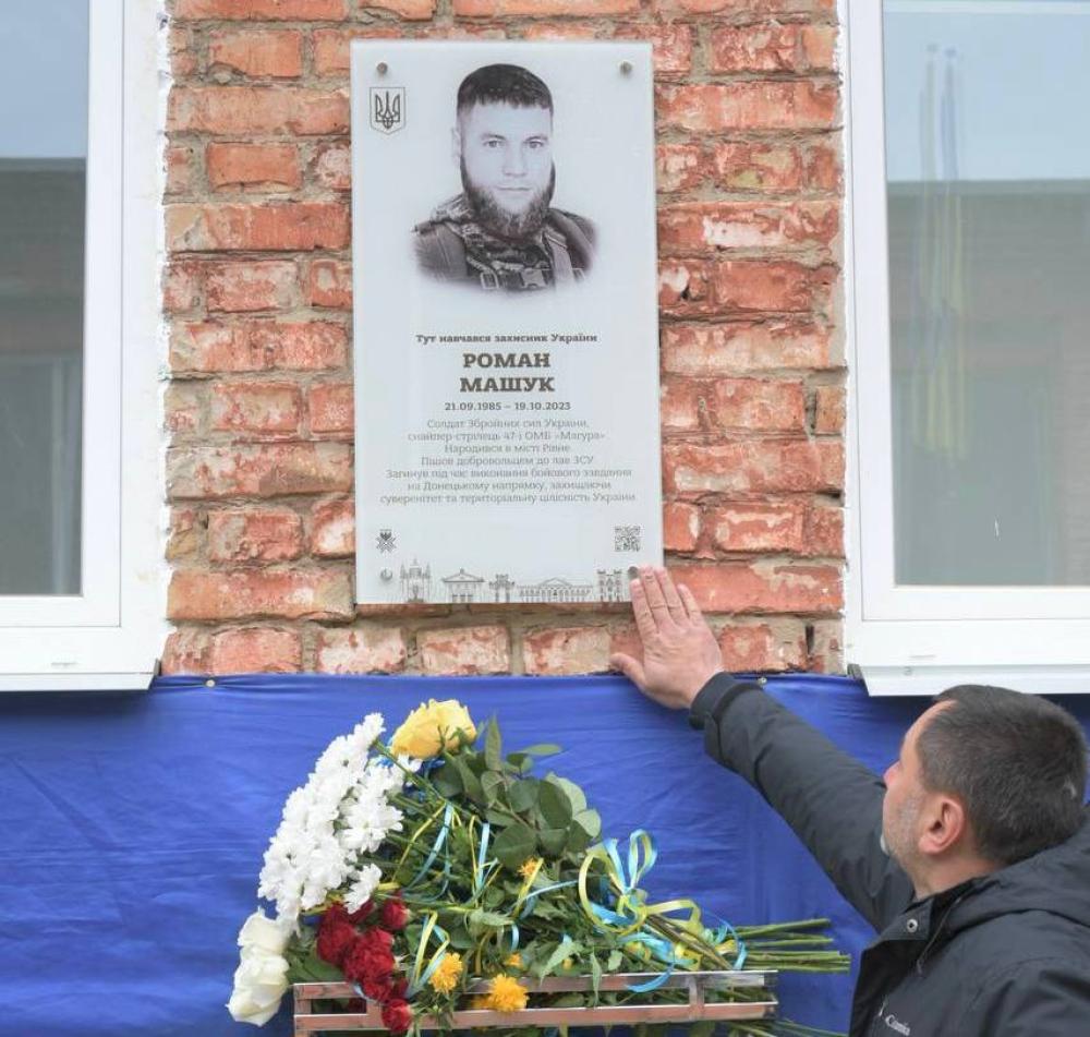 Днями на фасаді Рівненського ліцею №1 відкрили меморіальну дошку на честь загиблого Героя, випускника закладу – Романа Машука.