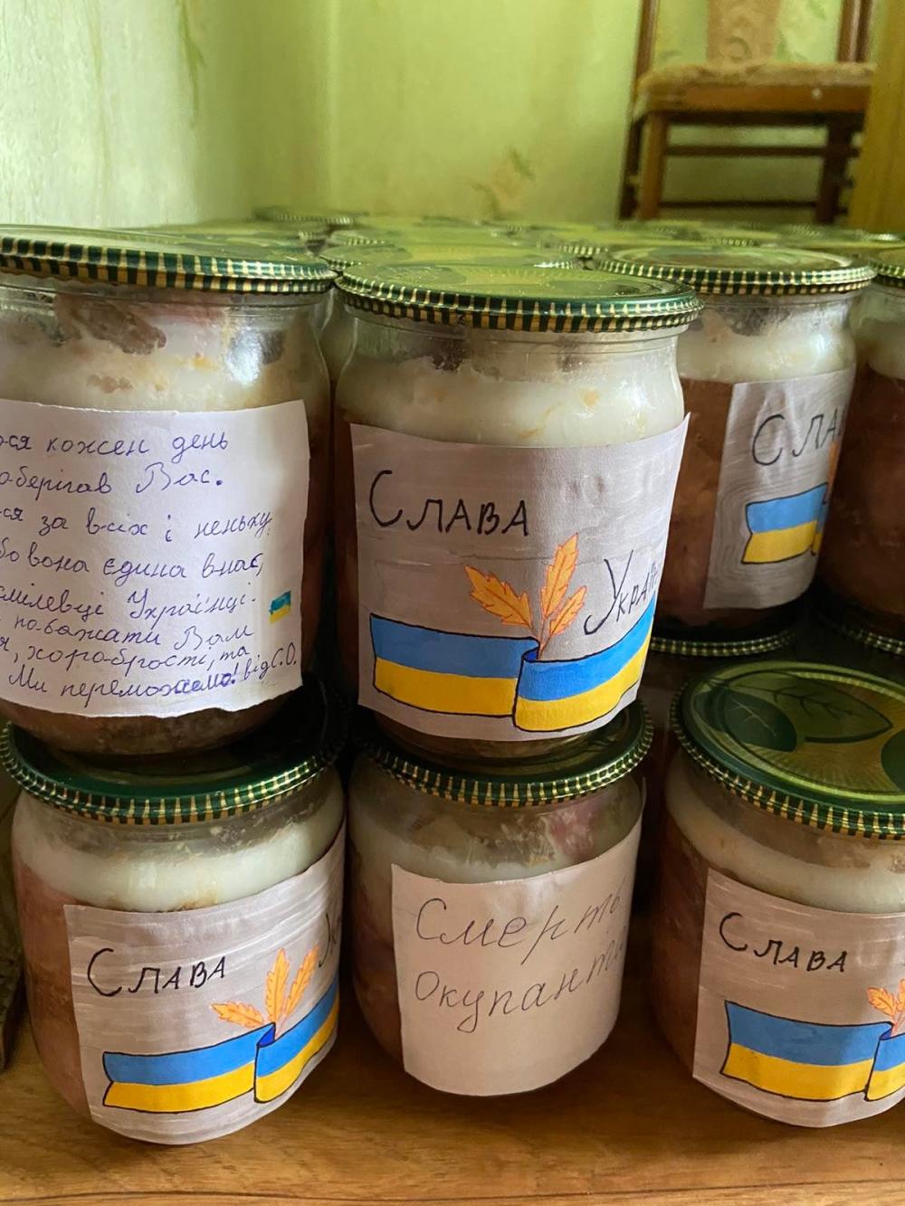 "Днями у Пугачівському старостаті односельчани за власні кошти закупили ось такої тушкованки (на фото) понад 500 банок. Апетиту додають креативні патріотичні етикетки. Продукція стане підтримкою нашим захисникам та жителям населених пунктів, де ведуться бойові дії", - йдеться у повідомленні.