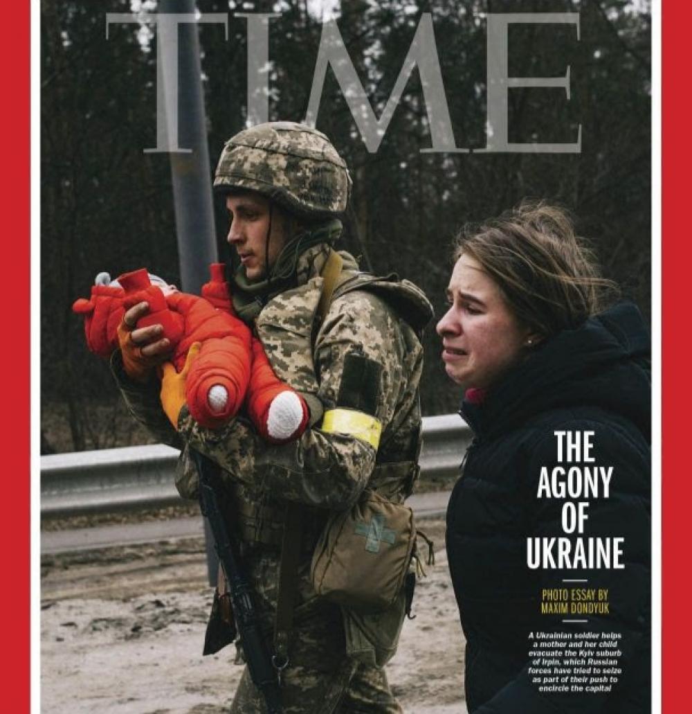 На обкладинці журналу зображений український військовий, який тримає на руках немовля. Поряд із ним йде жінка у сльозах. Стаття отримала назву "The agony of Ukraine".
