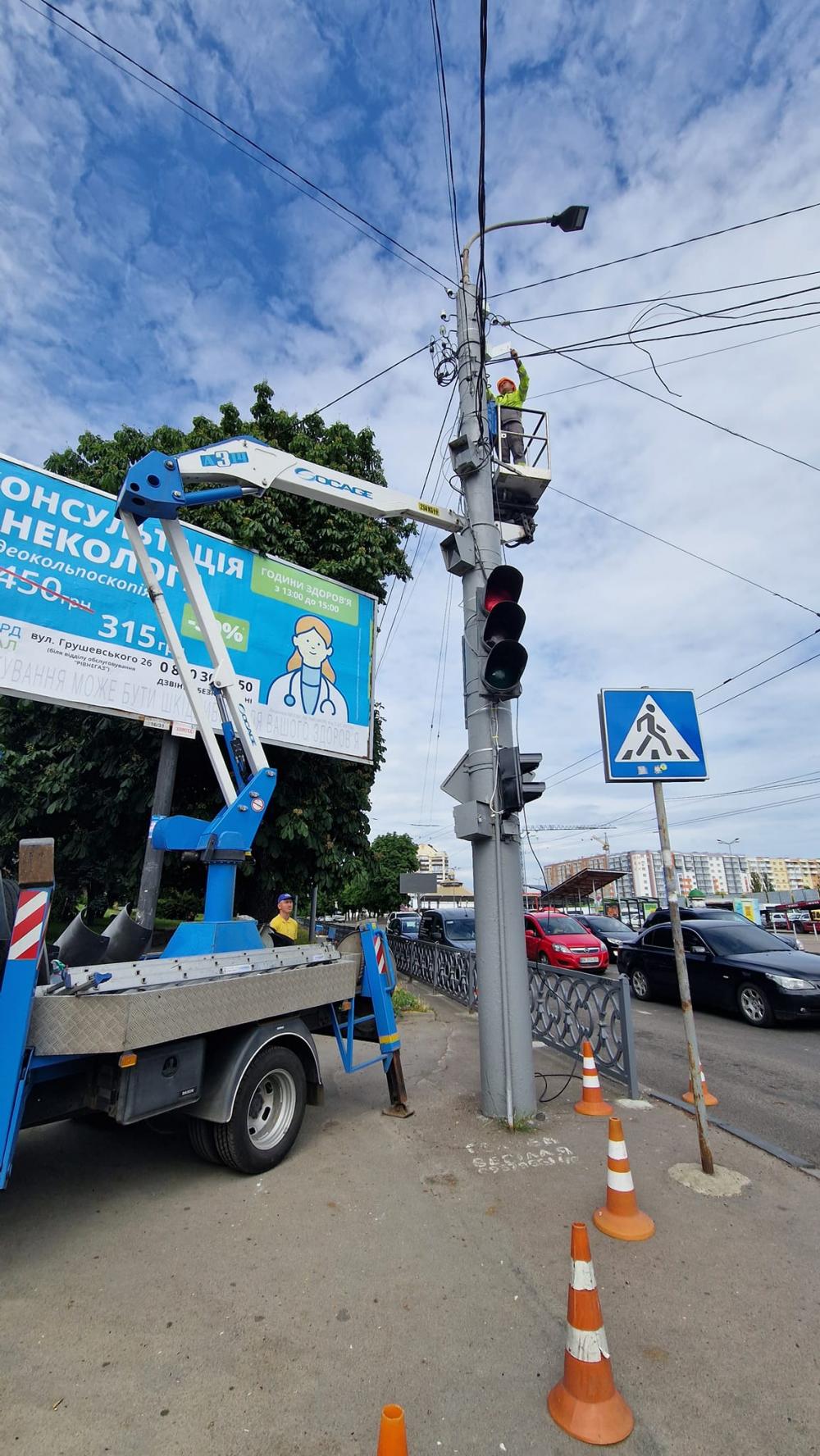Незважаючи на не зовсім сприятливі погодні умови, у Рівному продовжують роботи із заміни світлофорів.