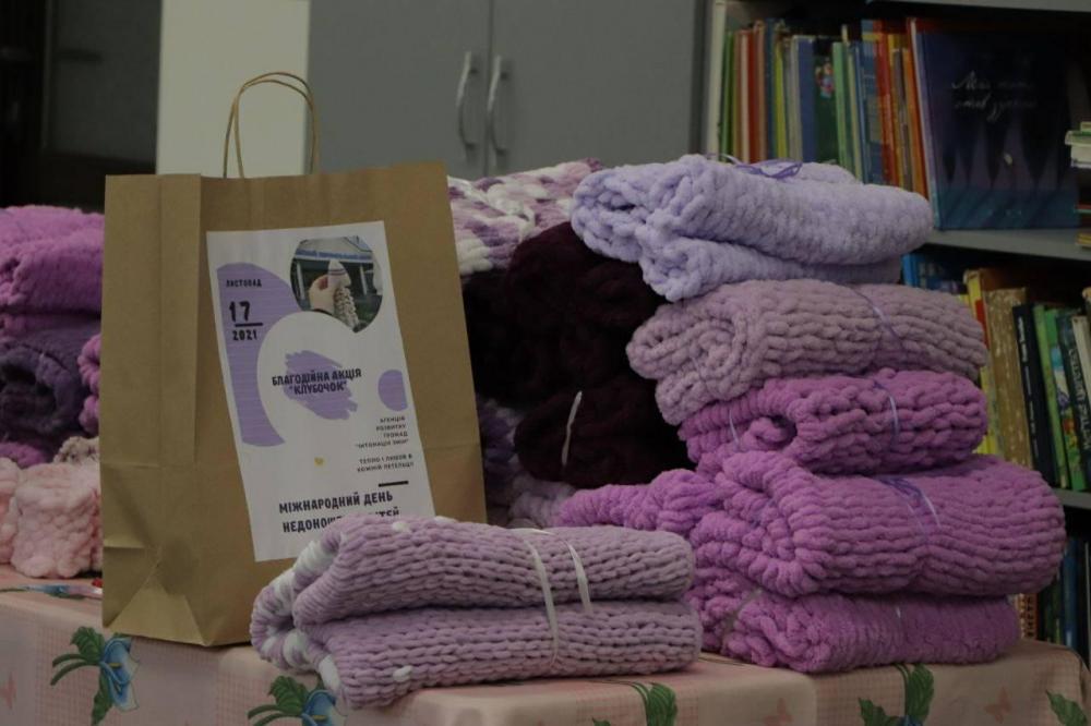 "Зупинилися на цифрі 85, але то ще не всі пледики, які вдалося зібрати з домашніх майстерень, де наші помічниці створювали ніжну фіолетову теплоту. Сьогодні збираємо решту виробів, тому заходьте у бібліотеку і на власні очі подивіться на результати спільної доброї справи)", - каже учасниця благодійної акції.