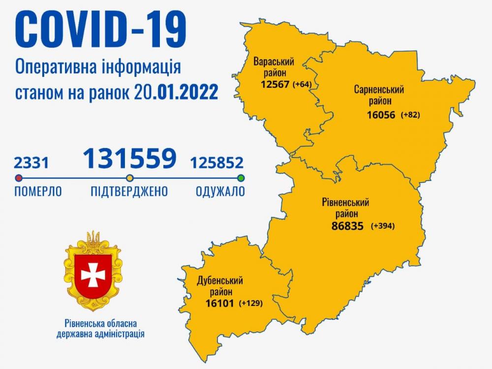 За минулу добу на Рівненщині зареєстровано 669 хворих з COVID-19. Найбільше хворих виявили у Рівному - 104, селі Деражне - 41, Дубно - 29, Вараші - 25, Радивилові - 23 та Сарнах - 20.