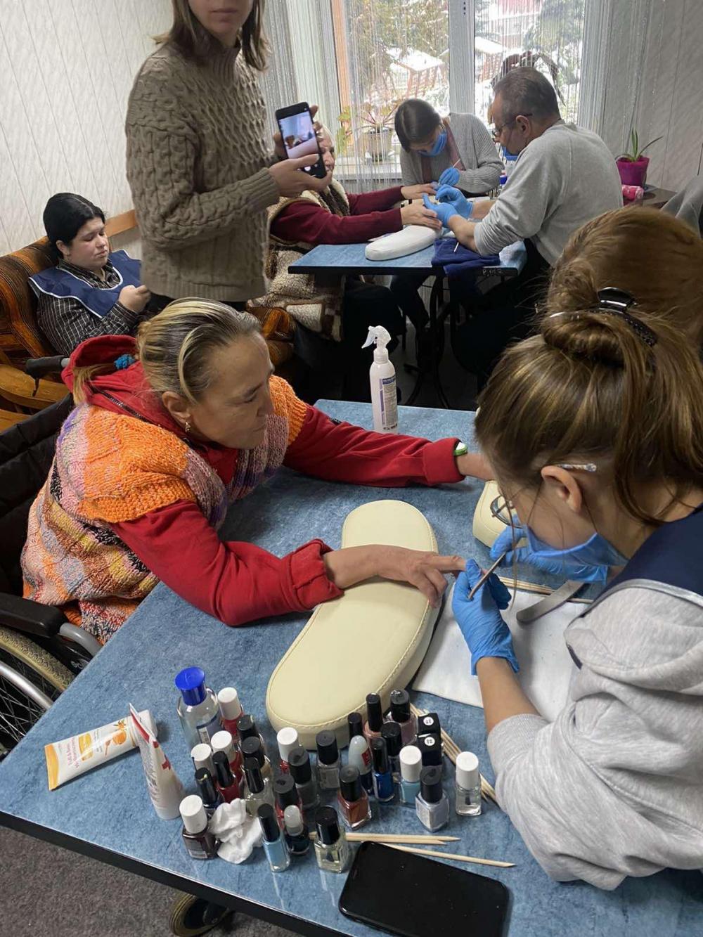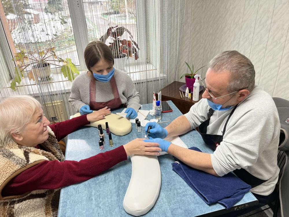 Люди похилого віку із пансіонату - вимушено переміщені мешканці Сходу країни, інваліди війни та за станом здоров’я – категорії клієнтів із особливими потребами, унікальними історіями та неймовірною людською енергетикою. Слухачі не лише відповідально та якісно надали послуги – стрижки, манікюр, педикюр, фарбування брів, – але й здобули важливий комунікаційний досвід та навички командної роботи в «позасалонних» умовах.