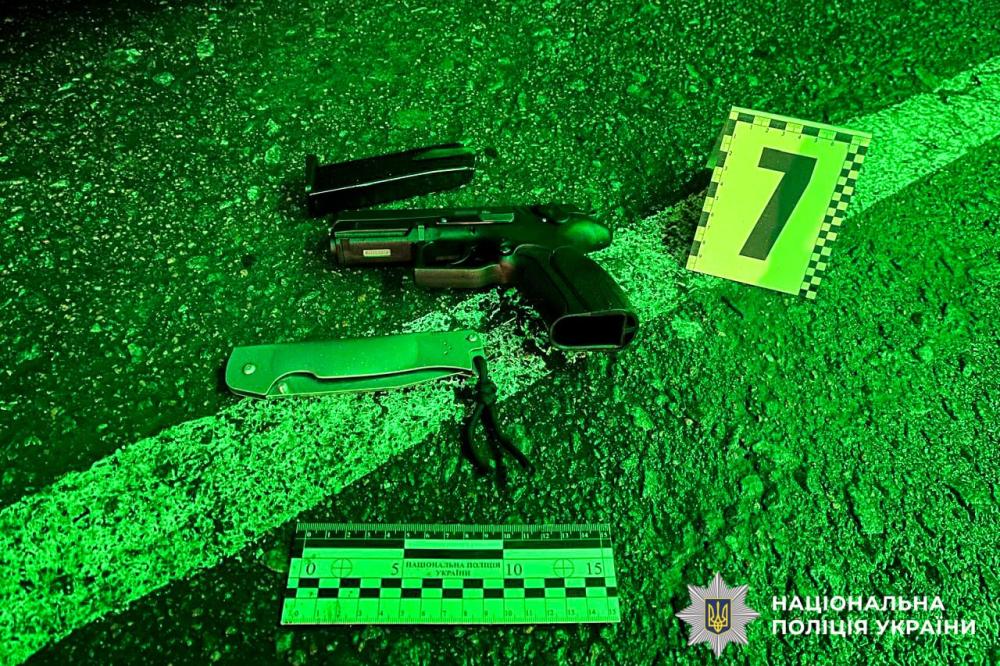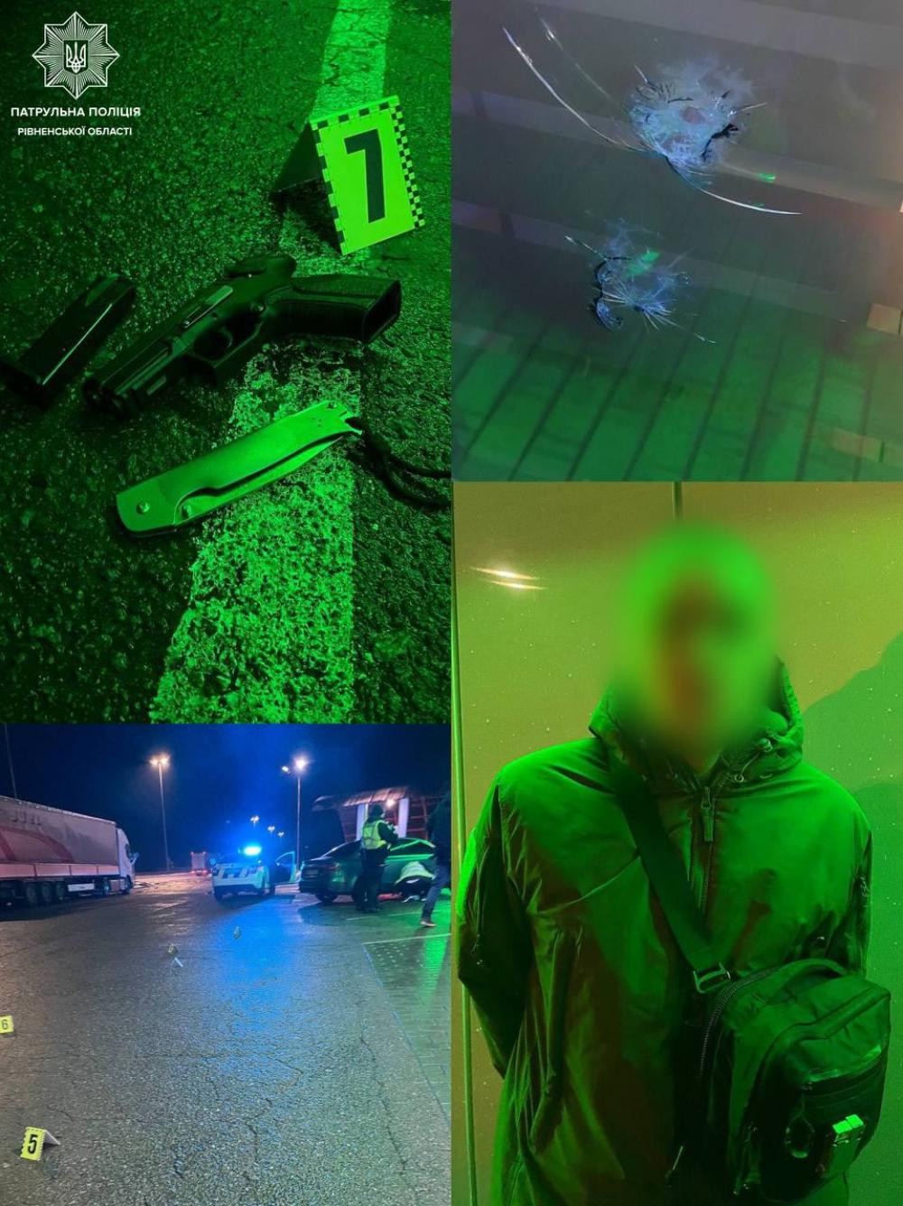 Коли водій легковика, який їхав із дружиною та малолітнім сином, зупинився на заправці, керманич «Scania» підбіг до нього, почав шарпати за одяг та наніс декілька ударів. У відповідь, 32-річний чоловік дістав із сумки травматичний пістолет «Flarm» та здійснив постріли у живіт і стегно 46-річного водія.