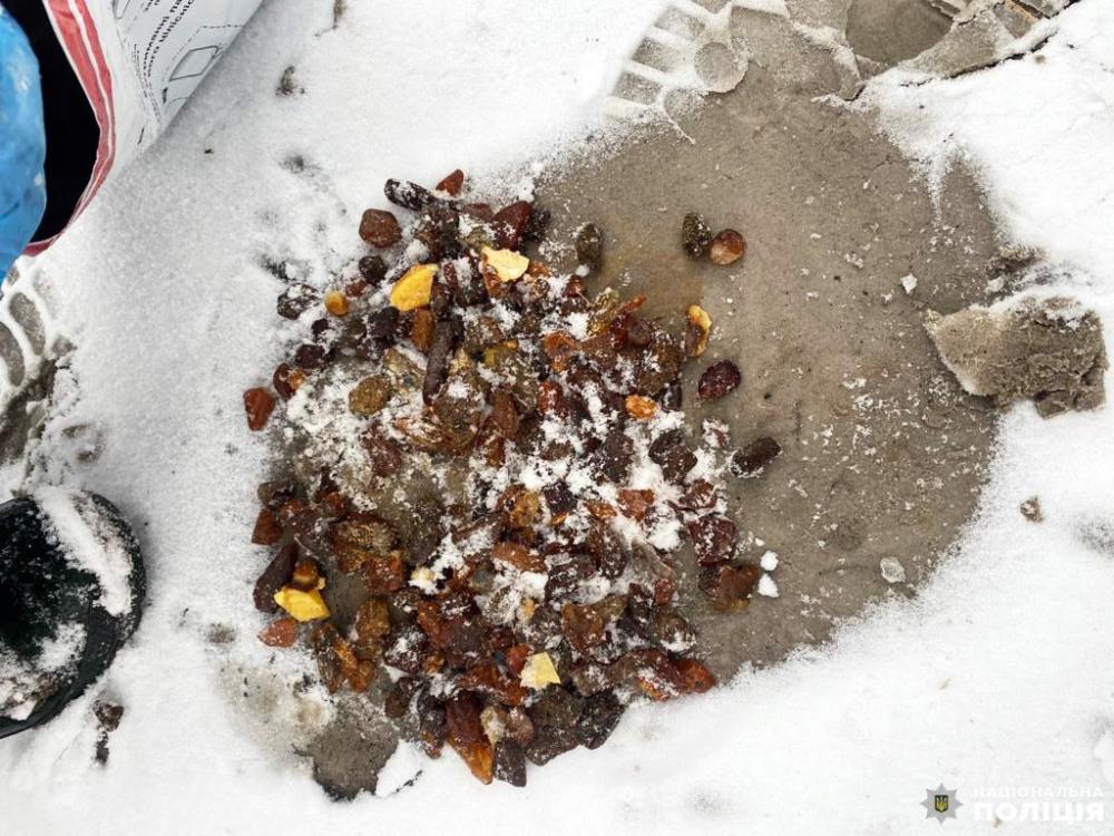 Під час слідчих дій поліцейські виявили та вилучили гусеничний тягач, каміння бурштину-сирцю, мобільні телефони та інші докази, які мають значення у справі.