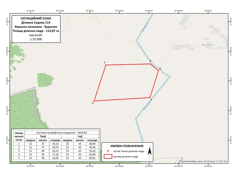 Відомо, що ділянка Садова 113 розташована у Вараському районі Рівненської області, на відстані 1,5 км на південний захід від околиці с. Ждань.
