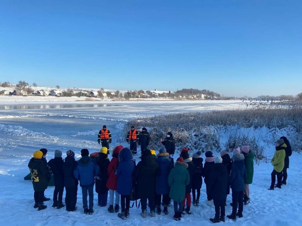 Під час заняття для дітей розказали про правила поведінки під час перебування на льоду та навчали правил рятування на випадок, якщо вони стануть свідком нещасного випадку на водоймах.