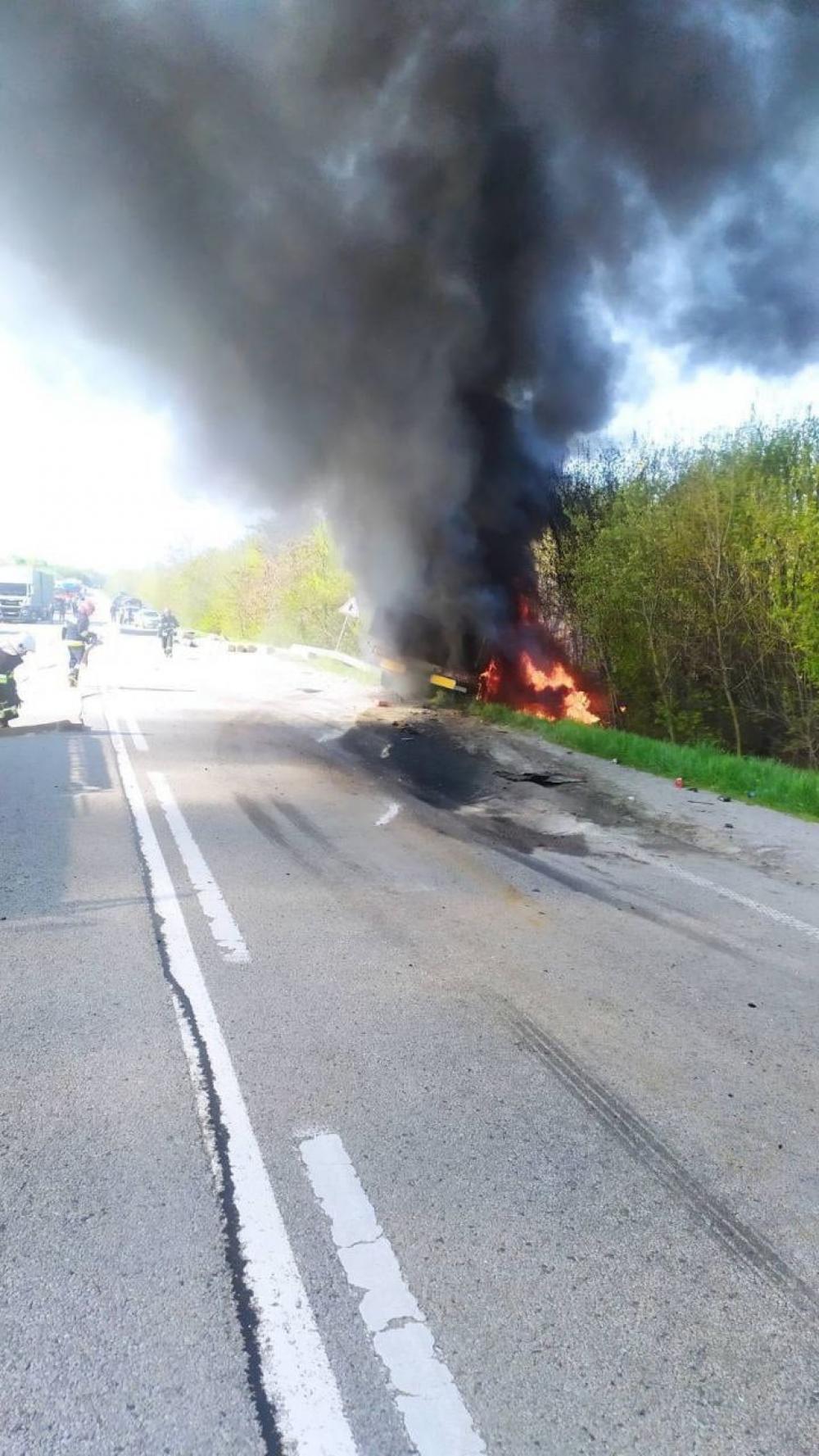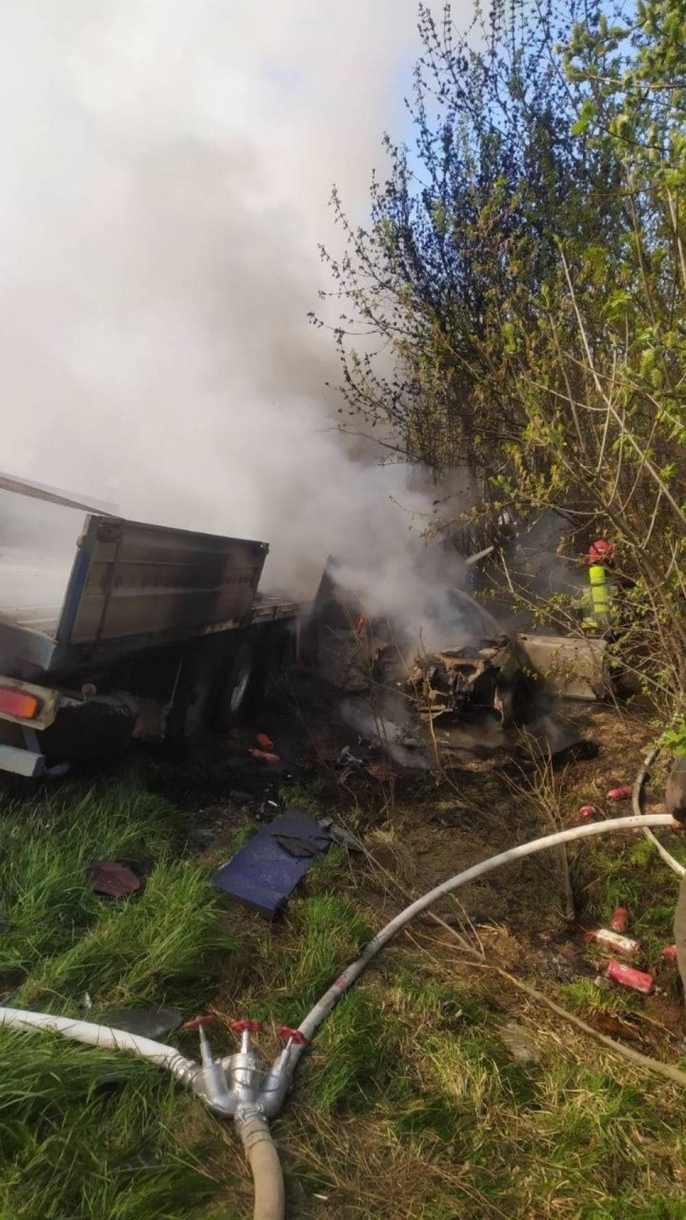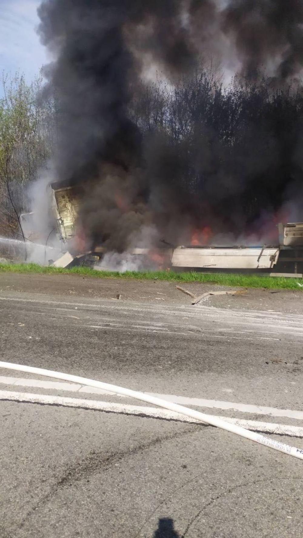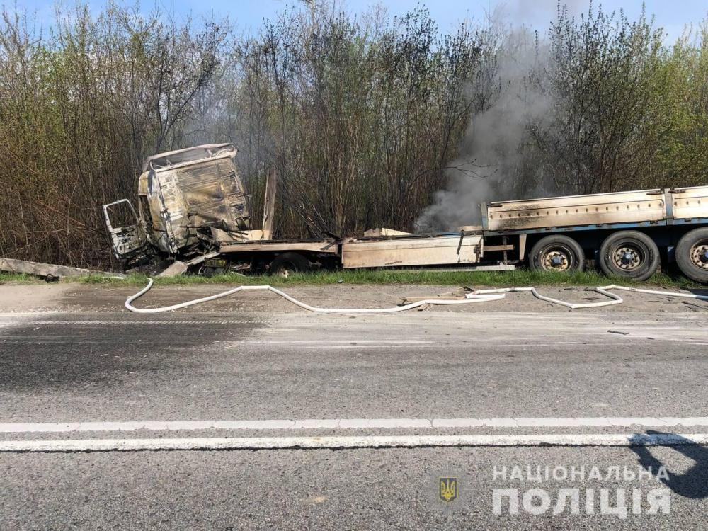 Керманича цього ж транспортного засобу, який згорів вщент, госпіталізували до реанімаційного відділення лікарні. Водій вантажівки перебуває у травматології