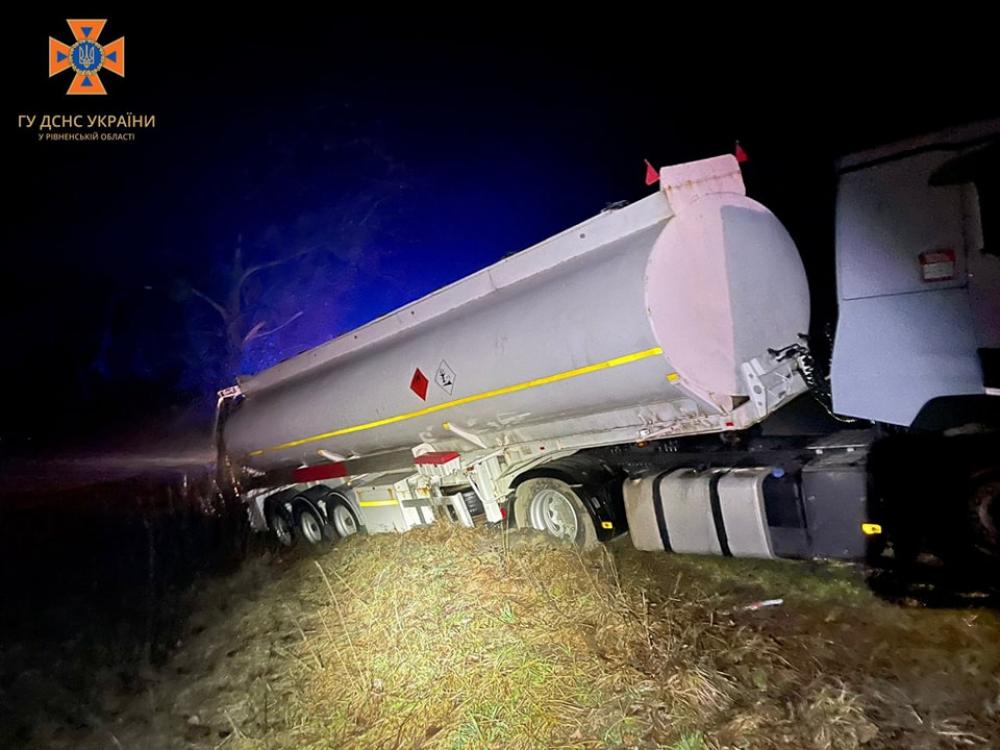 "Рятувальники з метою недопущення виникнення загорання, відключили клеми акумуляторних батарей в транспортному засобі та здійснювали пожежне чергування біля цистерни. На місці події представниками фірми було організовано перекачку палива в іншу цистерну. Після чого бензовоз було відбуксировано на проїжджу частину дороги", - розповіли у пресслужбі ДСНС.