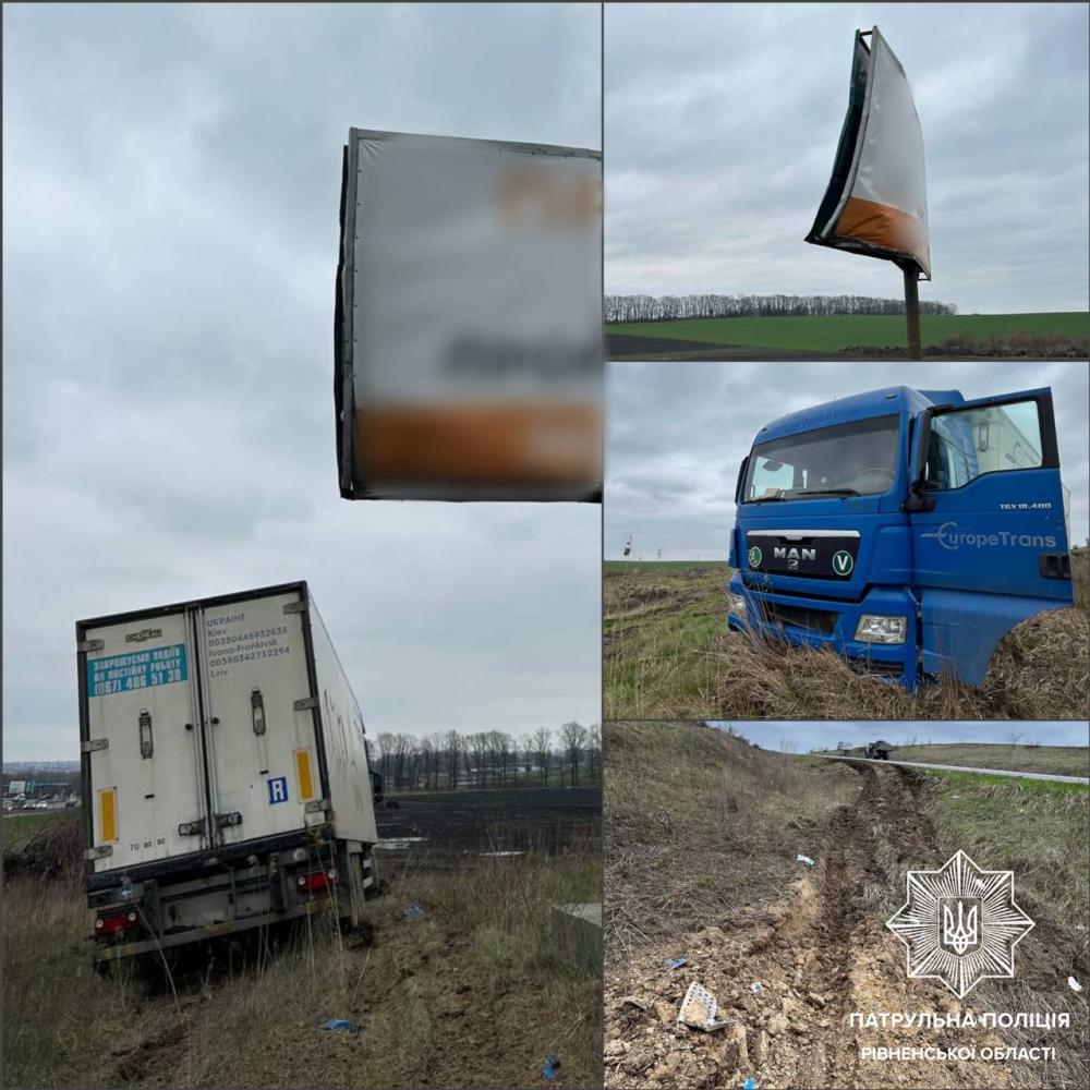 На Рівненщині вантажівка пошкодила рекламний щит і з`їхала в кювет.