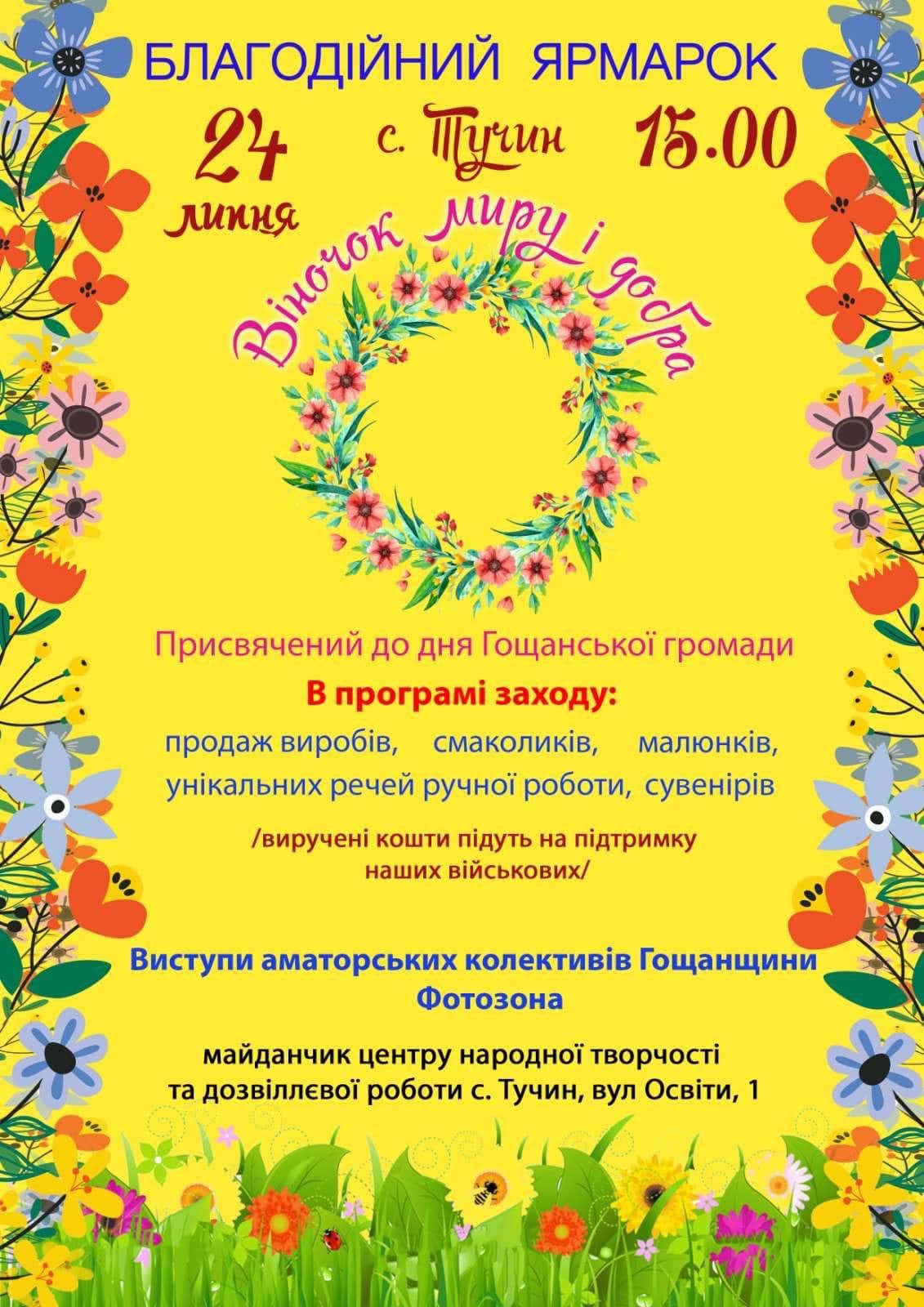 Сьогодні, 24 липня, у селі Тучин відбудеться благодійний ярмарок «Віночок миру та добра» присвячений до дня Гощанської громади.
