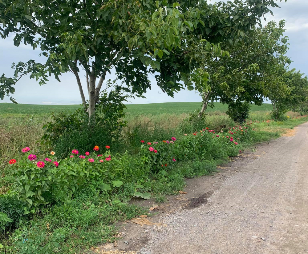 Уздовж дороги на в'їзді у село квітнуть чорнобривці та майори.