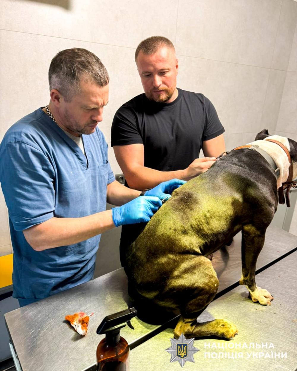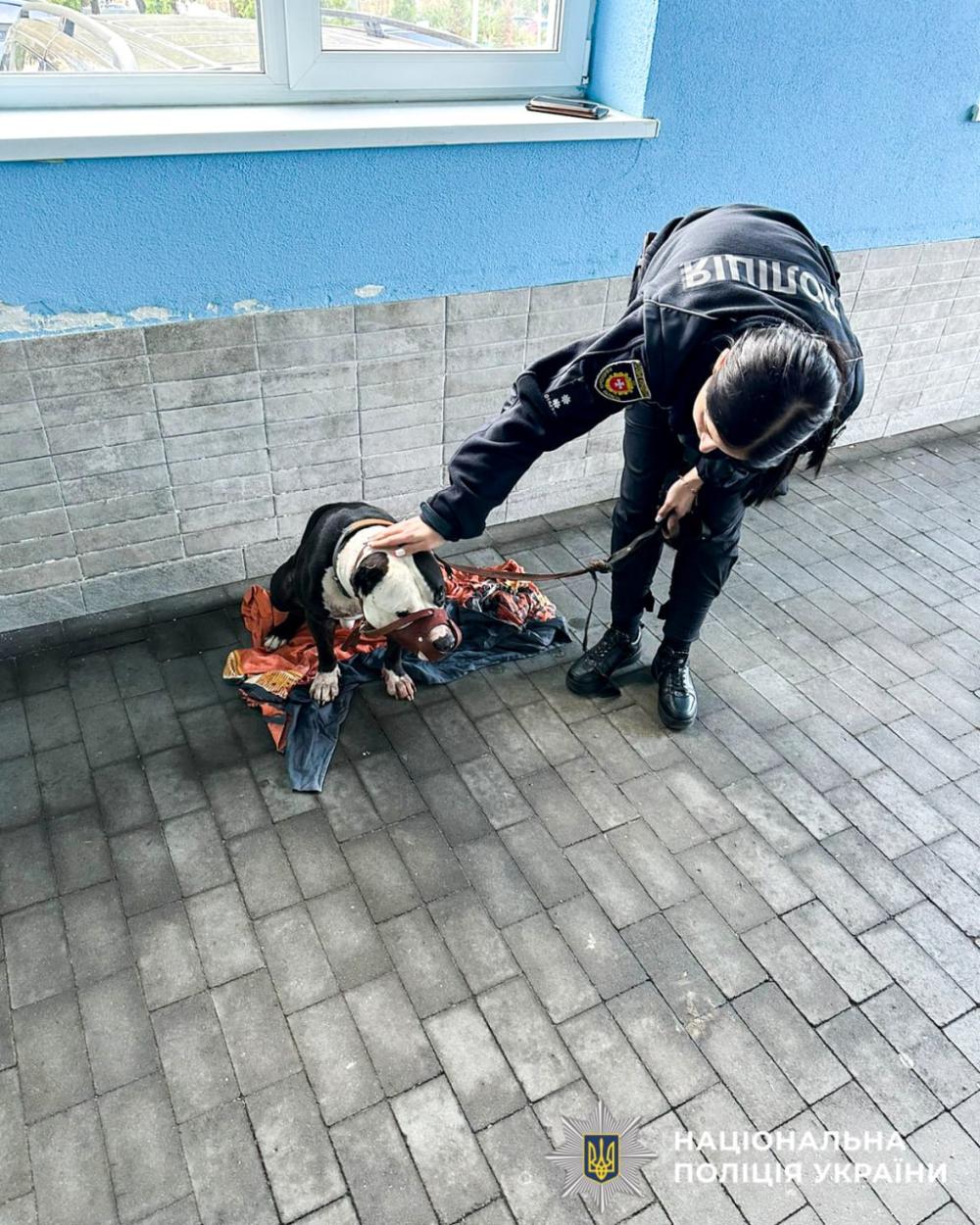 Закривавленого та змореного стафф тер’єра виявили правоохоронці, які прибули на місце події.