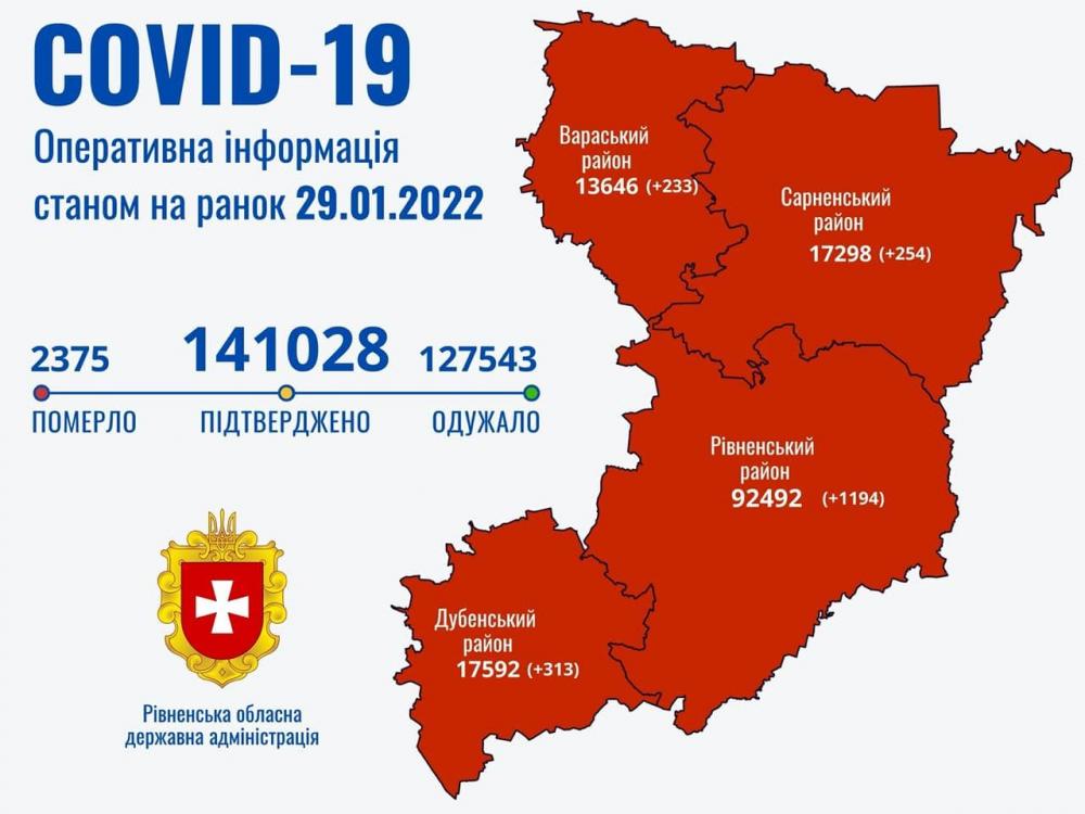 В області зареєстровано 2375 летальних випадків, спричинених COVID-19. Померли 65-річна жителька смт Рокитне, 33-річна жителька м. Острог, 63-річний житель с. Козлин Рівнгенського району, 52 і 67-річні жителі м. Рівне.