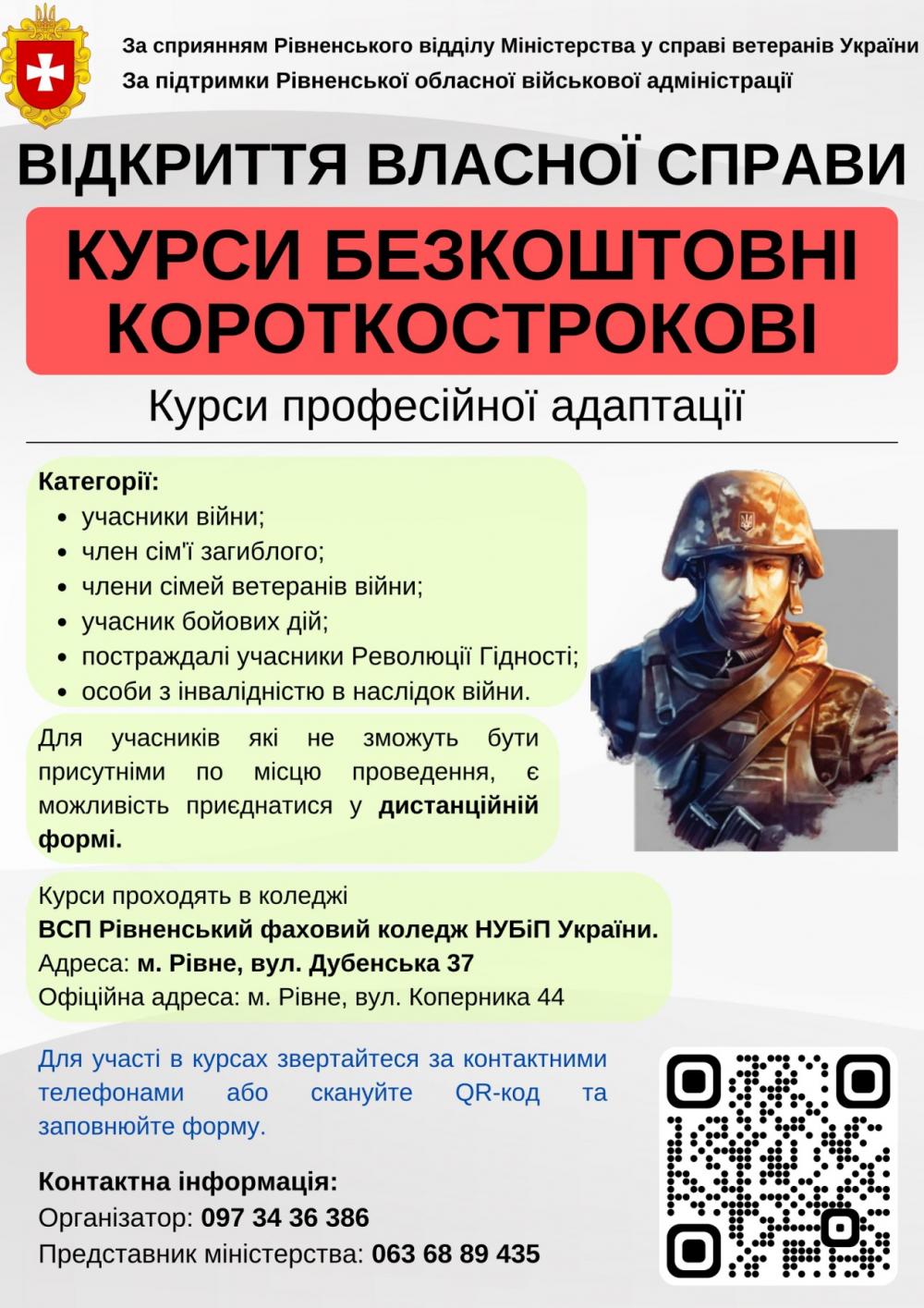 Органи соцзахисту спільно з Рівненським фаховим коледжем Національного університету біоресурсів та природокористування України розробили програму спеціалізованих курсів професійної адаптації для військових та їх сімей.