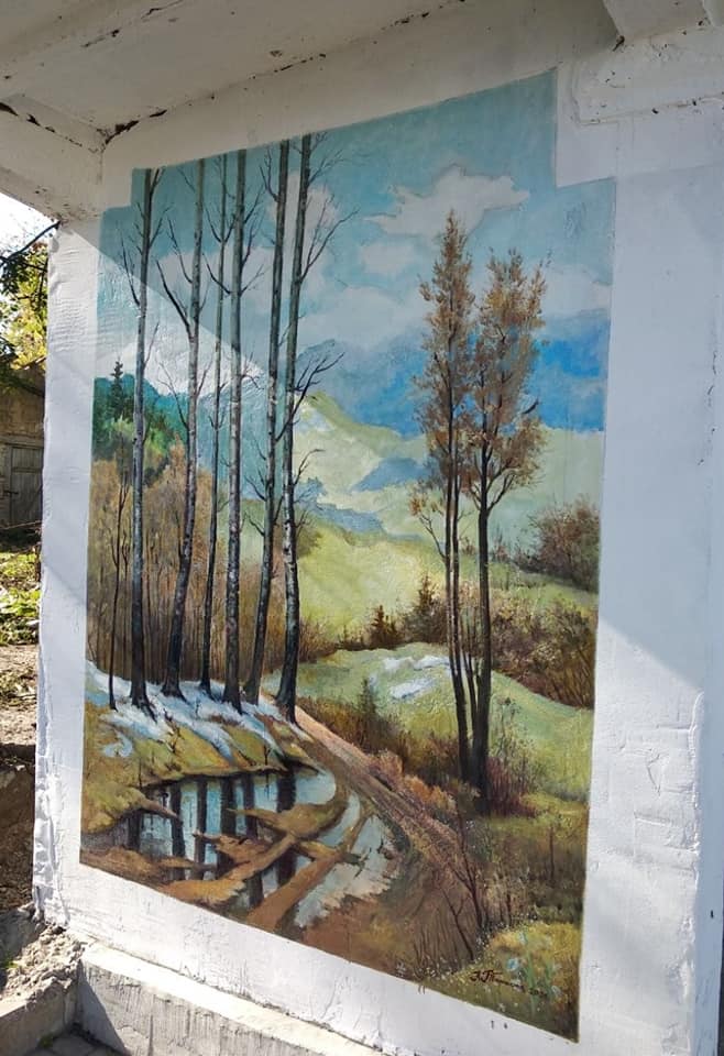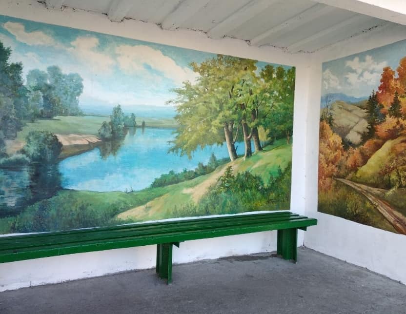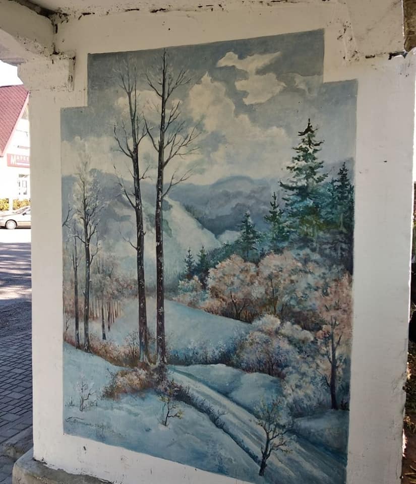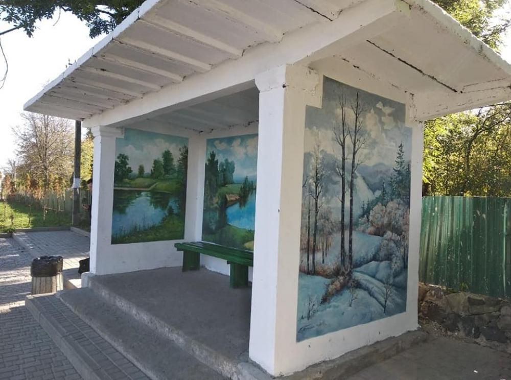 Справжні картини на стінах зупинки зобразив ісцевий художник Павло Тарасюк. Кожна з них передає красу природи рідного краю.
