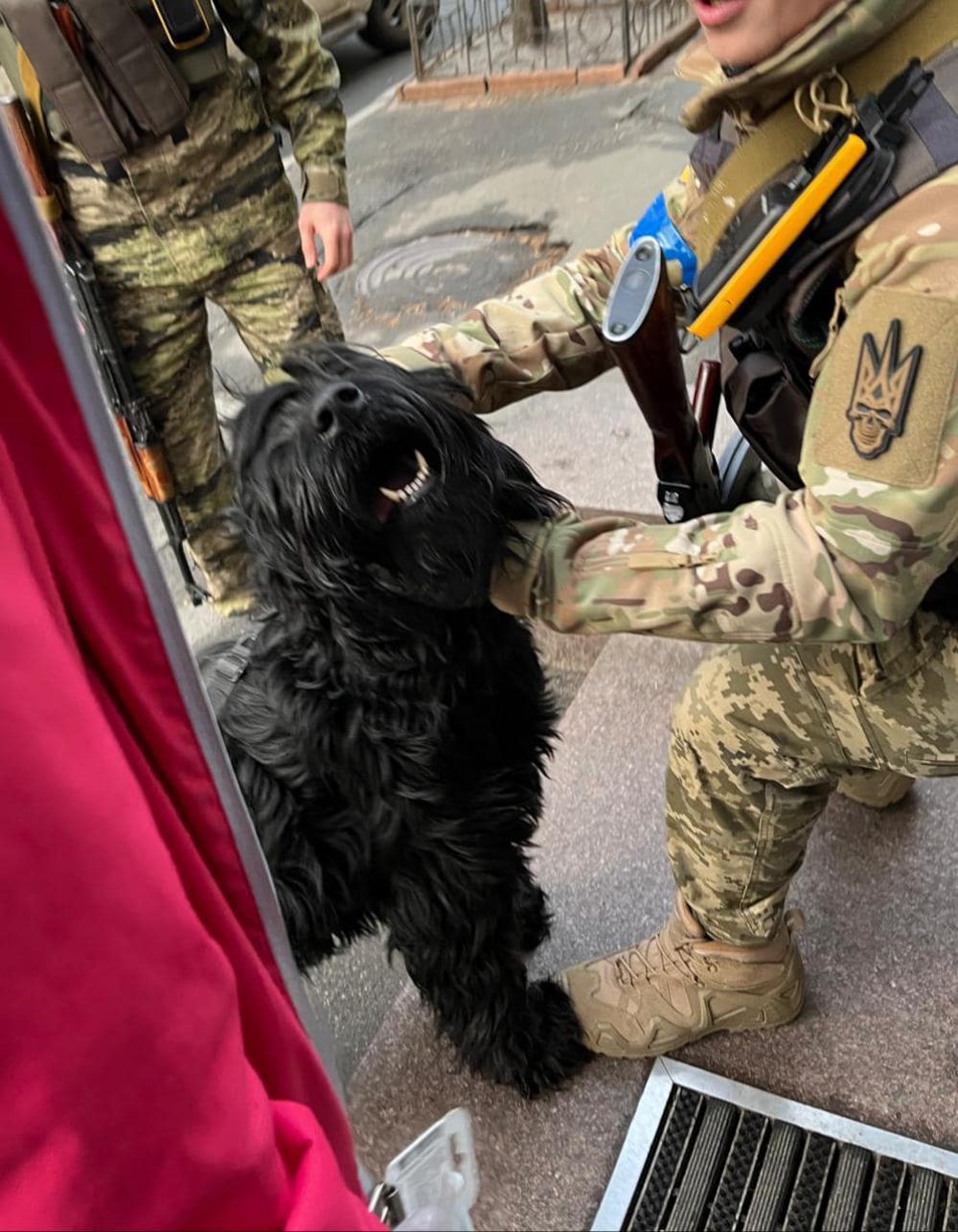 Собаку знайшли 29 березня бійці 72ої бригади в Ірпені. Вона була в замкненій хаті. Хата побита від обстрілів. На столі лежали її документи. Це різеншнауцер, 6 років, звуть за документами Баварія. Собаку з оперативним черговим 72-ої бригади (це наш Тоха) у розбитому будинку зняли журналісти Reuters і Deutsche Welle, відео розійшлися соцмережами. Фото собаки українського фотокора Гліба Гаранича почали перепощувати у твіттері і Фейсбуці. Дісталося навіть США.
