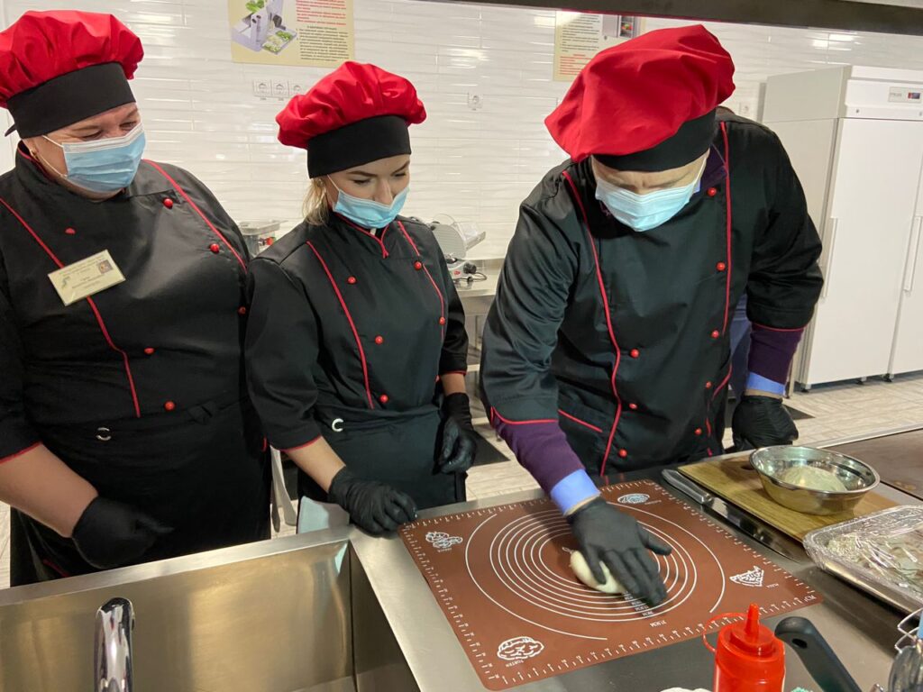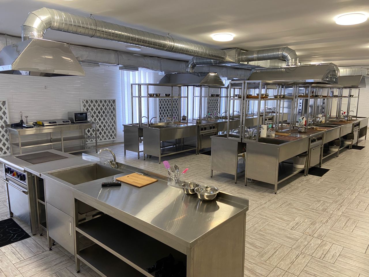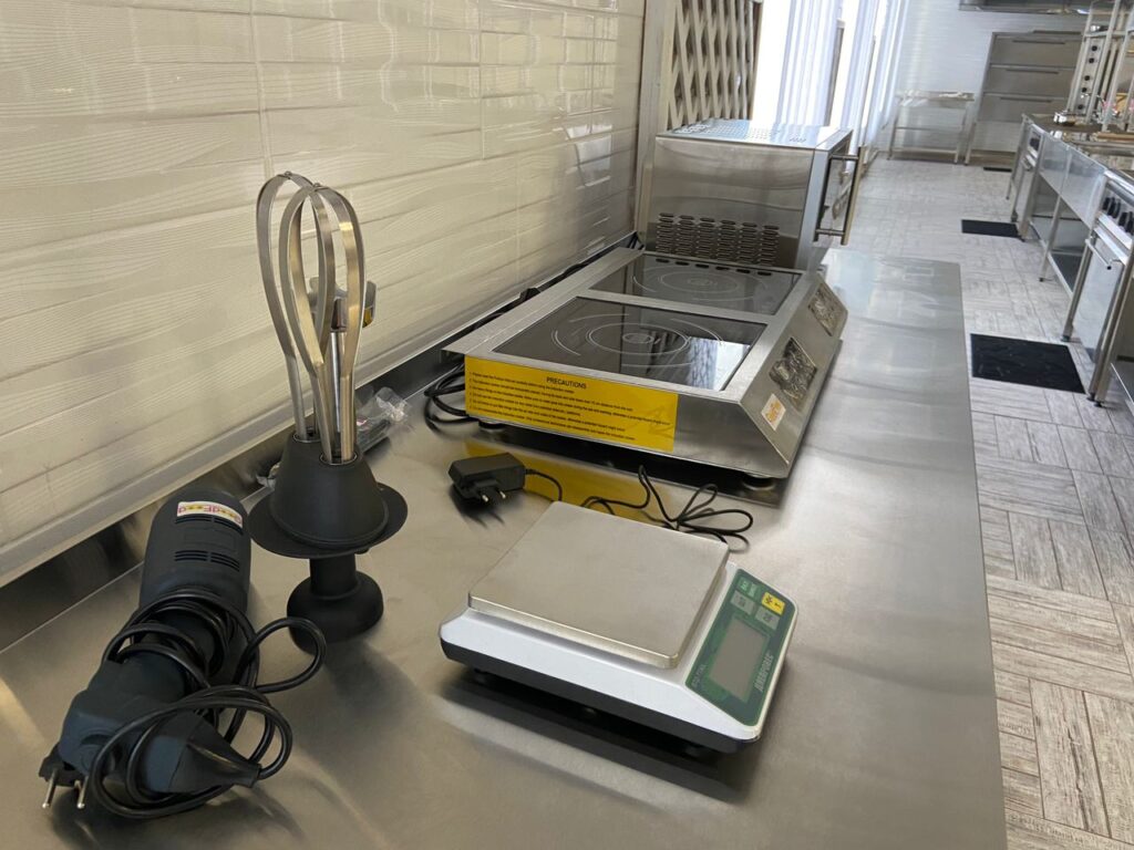 Виробнича майстерня центру забезпечена сучасним обладнанням для відпрацювання практичних навичок. Серед устаткування – холодильні шафи, м’ясорубки, слайсер, мікрохвильовка, печі, плити, міксери та інший кухонний інвентар.
