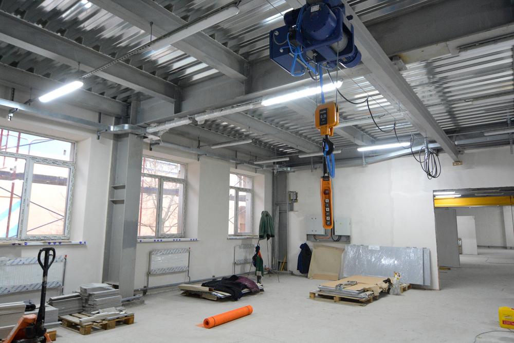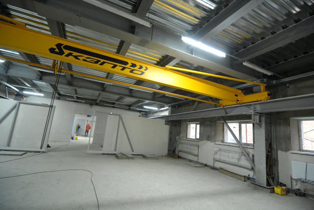 Нині вже змонтовано підіймальний кран та електричну таль вантажопідйомністю відповідно до 5 тонн та до 500 кг. Залито фундамент під металообробні верстати, монтується витяжна вентиляція над зварювальними постами, влаштовуються трубопроводи для живлення пневматичного інструменту.