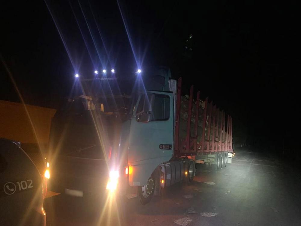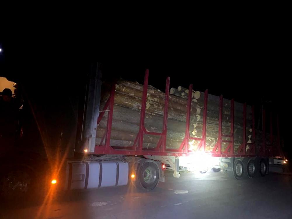 Учора ввечері на вулиці Центральній у селі Кисоричі поліцейські зупинили тягач «Volvo» із напівпричепом, завантаженим сосновими колодами довжиною по 4,5 м.