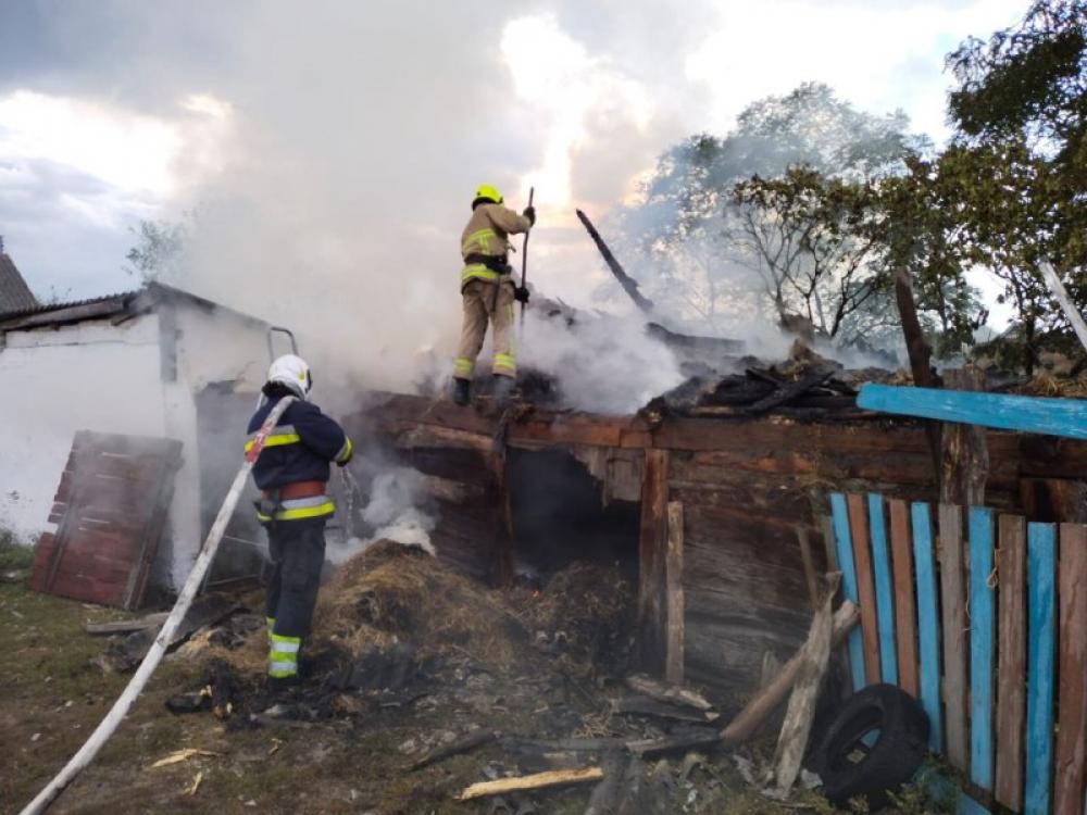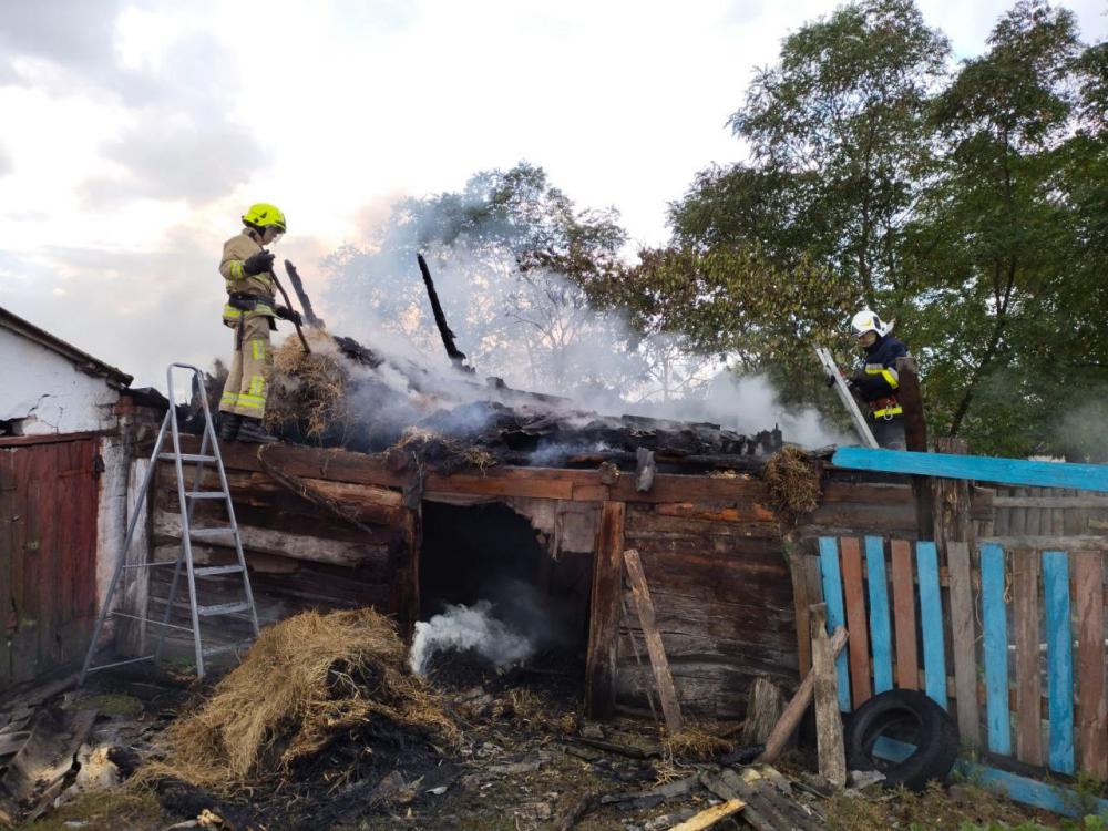 "В приватному господарстві вогнем знищено дах та перекриття господарчої будівлі (дерев’яної, критої шифером по дерев’яній обрешітці, розміром 3х5м) та 0,2 т. сіна", — йдеться у повідомлені.