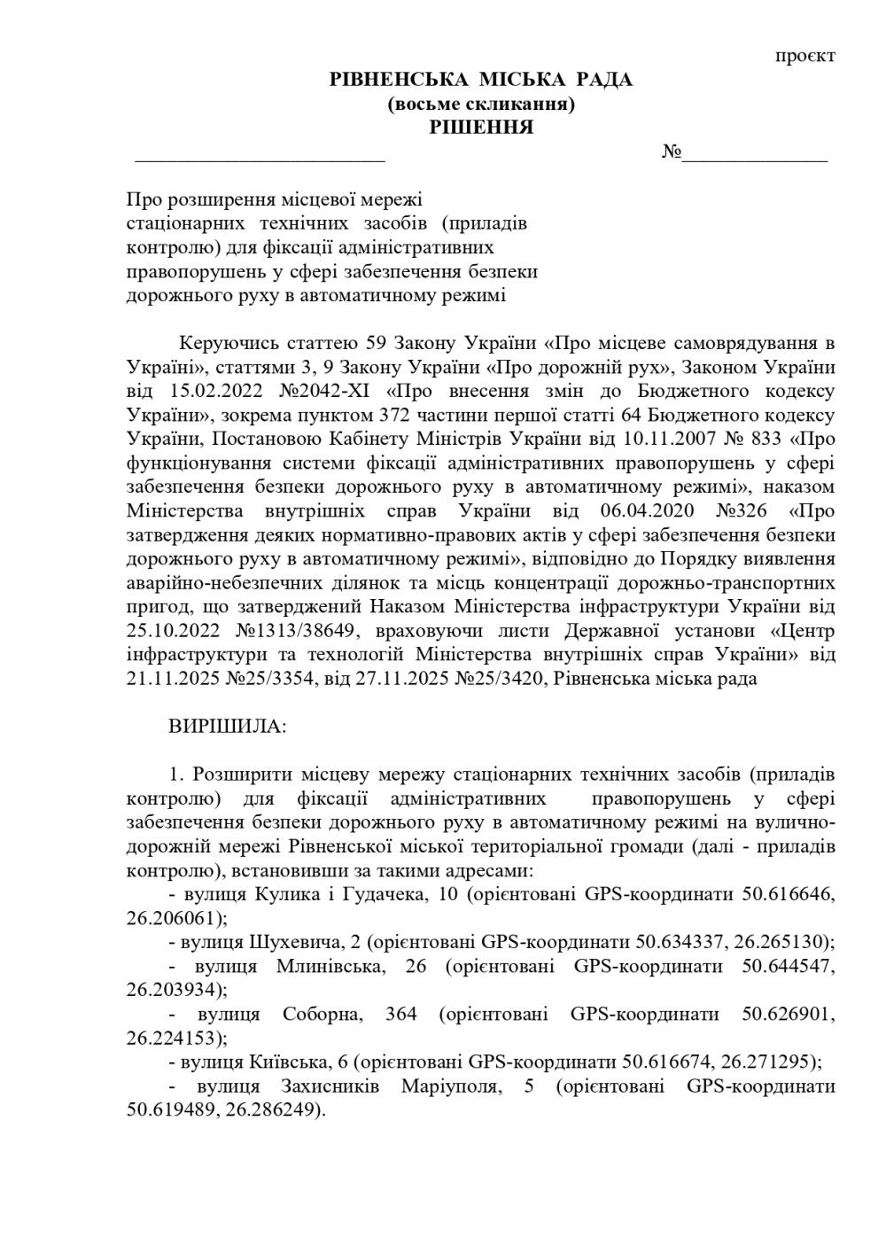 На черговій сесії Рівненської міської ради планують розглянути проєкт рішення щодо розширення місцевої мережі стаціонарних камер автофіксації порушень правил дорожнього руху. У документі йдеться про встановлення нових приладів контролю на аварійно небезпечних ділянках доріг.