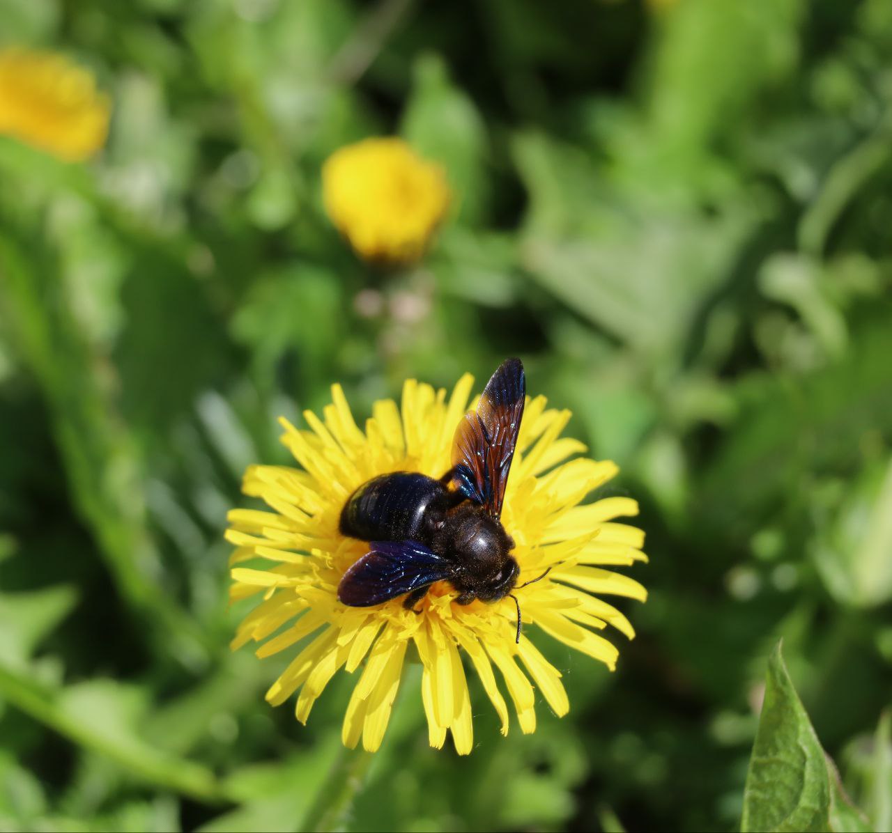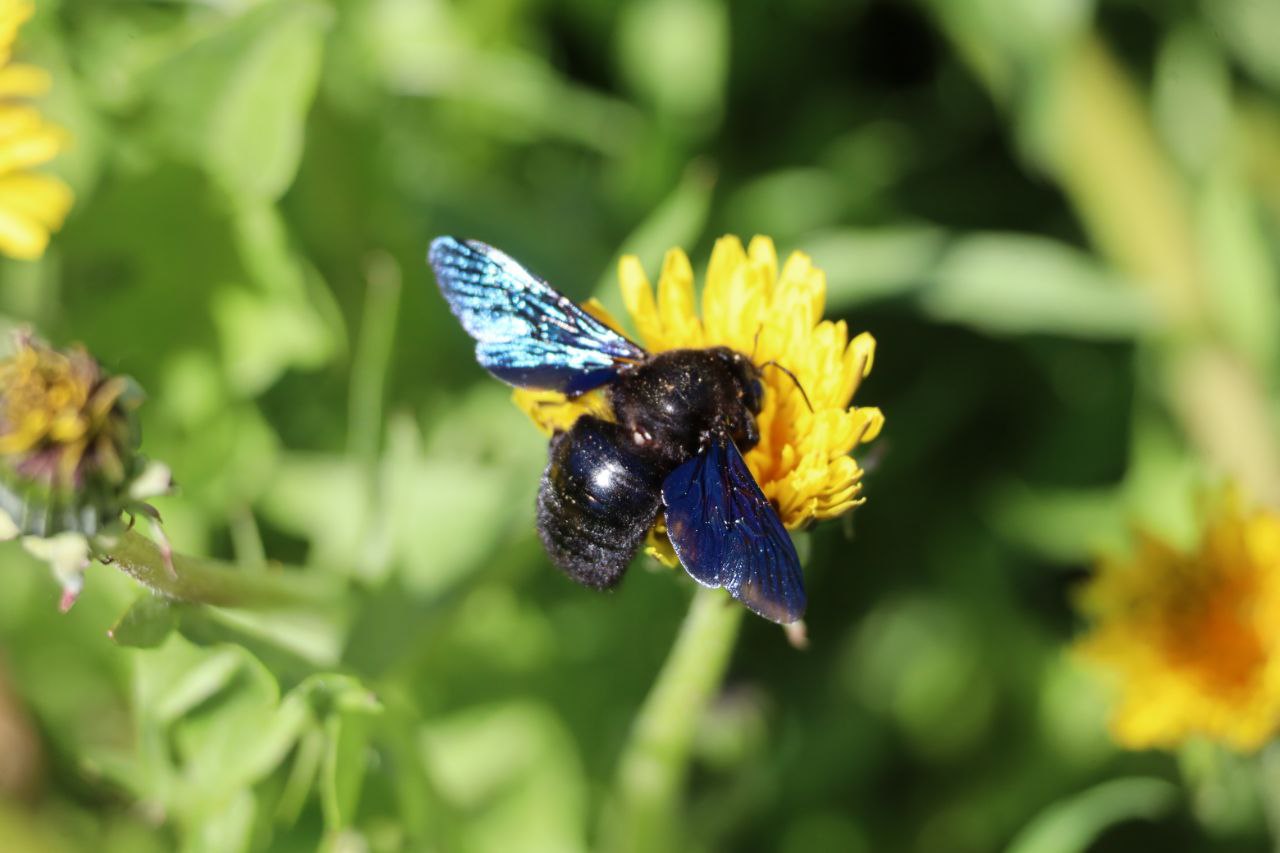 Ідеться про бджолу-тесляра (Xylocopa) — одну з найбільших бджіл у нашій фауні, яку легко впізнати за глянцевим чорним тілом із синьо-фіолетовим відблиском і характерним гулом під час польоту.