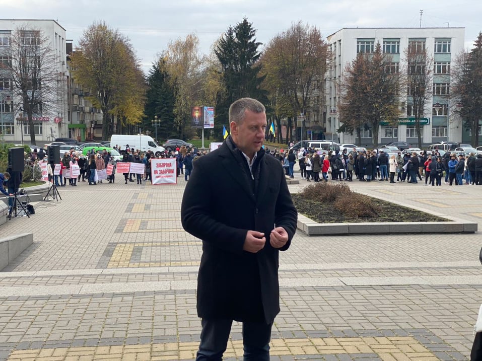 На пікет біля Рівненської ОДА, вийшли підприємці з усієї області. Вони протестують проти карантину вихідного дня, який влада планує запровадити в Україні.