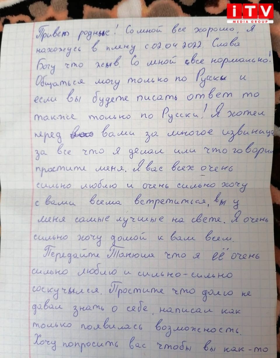 "Написав, що в полоні. Лист написаний його почерком, там був його підпис.Там стояли печатка, що завірено російськими службами. Він не міг нічого такого там написати, тому що все контролювалося. Написав: "слава богу, что жив". Сказав, щоб берегли себе та молилися за нього. Я написала відповідь теж російською мовою", - розповіла тітка захисника.