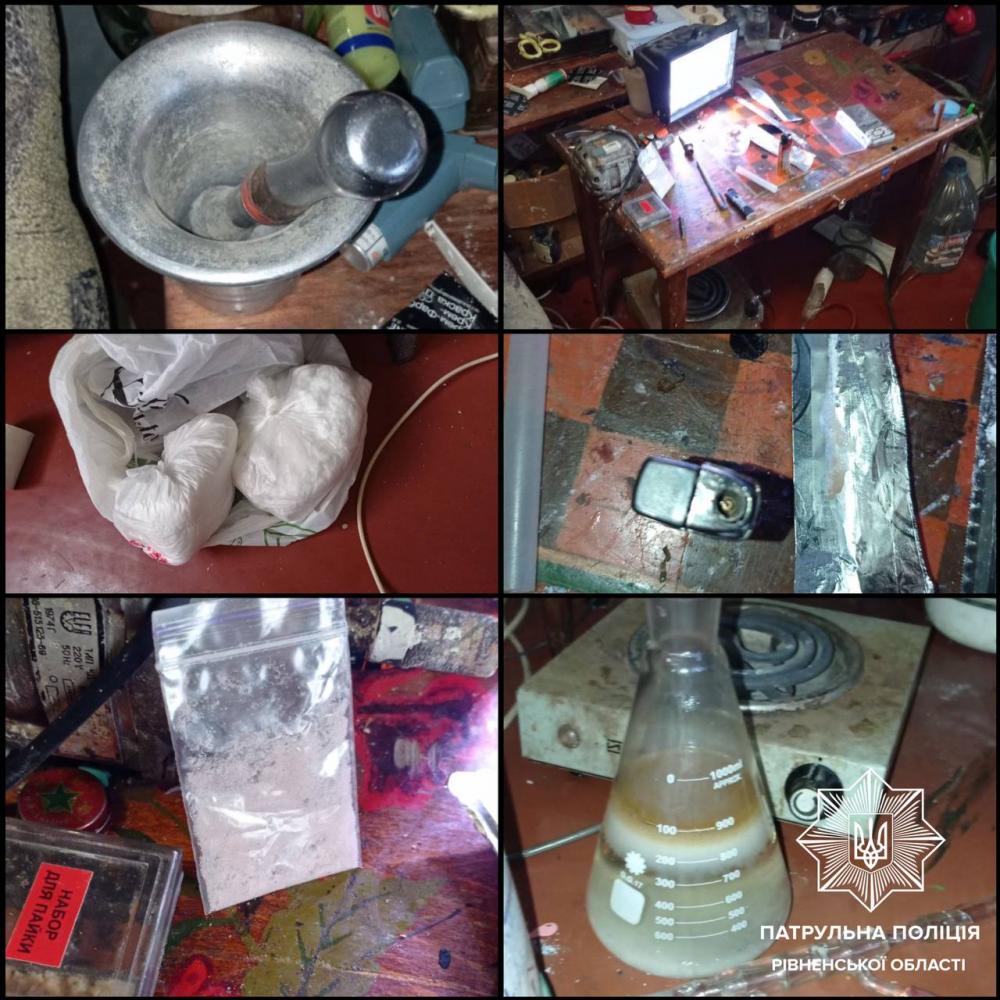 Чоловік пояснив, що там його власна лабораторія, де він виготовляє наркотичні речовини. Ще він показав патрульним zip-пакет у якому, за його словами, був первітин власного виробництва. Окрім цього, 43-річний рівнянин продемонстрував поліцейським прекурсори. Як зазначив, це були червоний фосфор, йод кристалічний, розчин соляної кислоти, ізопропіловий спирт, місткість для мелення пігулок і самі таблетки. А на столі лежала лампа та фольга із нашаруванням білої речовини.