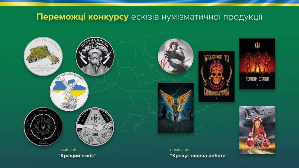 Інші ескізи та творчі роботи Національний банк також буде втілювати в нумізматичній продукції України (пам’ятних монетах, медалях, сувенірних банкнотах тощо), про що буде повідомлено додатково.