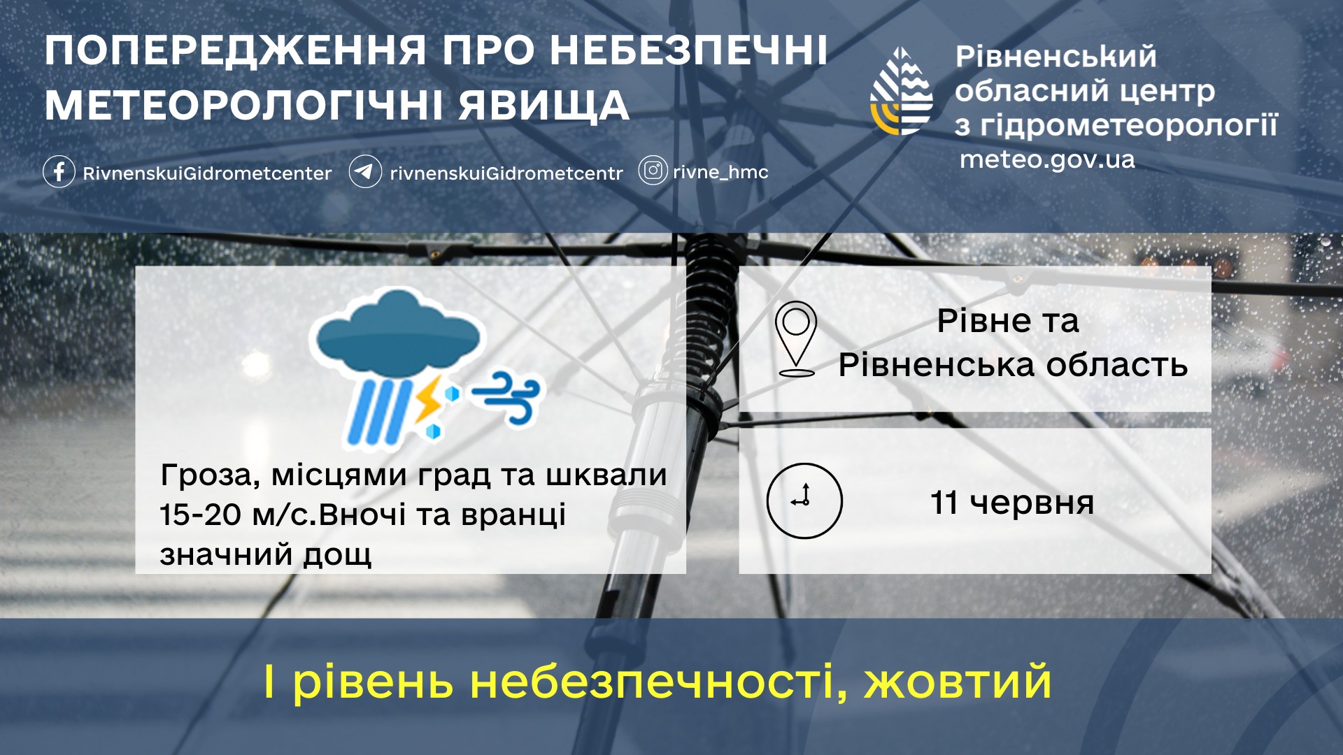 Упродовж доби 11 червня на Рівненщині очікується жовтий (І) рівень небезпеки.