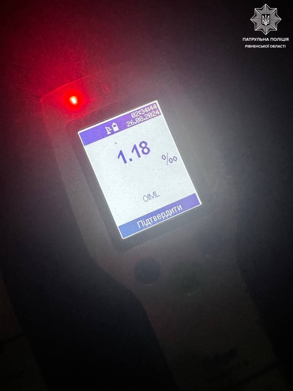 У неповнолітньої громадянки поліцейські виявили ознаки алкогольного сп'яніння. Дівчина пройшла огляд на стан сп'яніння у присутності педагога. Результат виявився позитивним: 1,18 проміле алкоголю в крові.