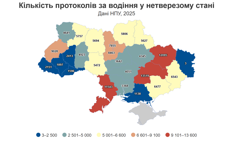 Найбільше нетверезих водіїв у країні зареєстровано на Дніпропетровщині — 13 519 протоколів, Харківщині — 12 095 та Одещині — 11 543. Найменше випадків зафіксовано на Херсонщині — 1 138, Чернівецькій — 1 596 та Івано-Франківській — 1 897 областях.