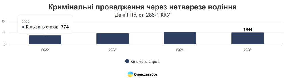 У 2025 році Генеральна прокуратура України відкрила понад тисячу кримінальних проваджень за нетверезе водіння. Загалом кожна 40-та ДТП із загиблими чи травмованими сталася за участю п’яного водія. У таких аваріях торік загинули 73 людини та 857 отримали травми.