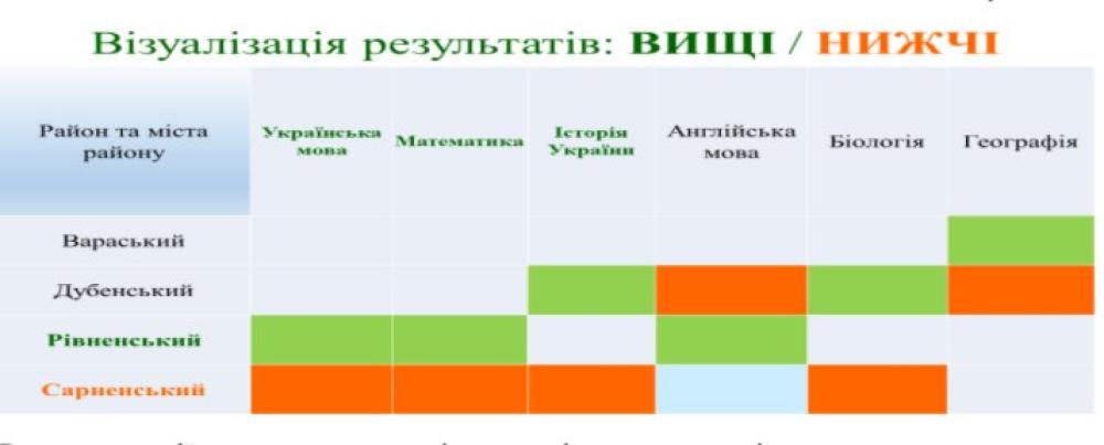 Результати показали, що найкращі показники за українською мовою, математикою та англійською мовою демонструють учасники Рівненського району, а найнижчі — у Сарненському районі, де проблеми були з українською мовою, математикою, історією України та біологією.