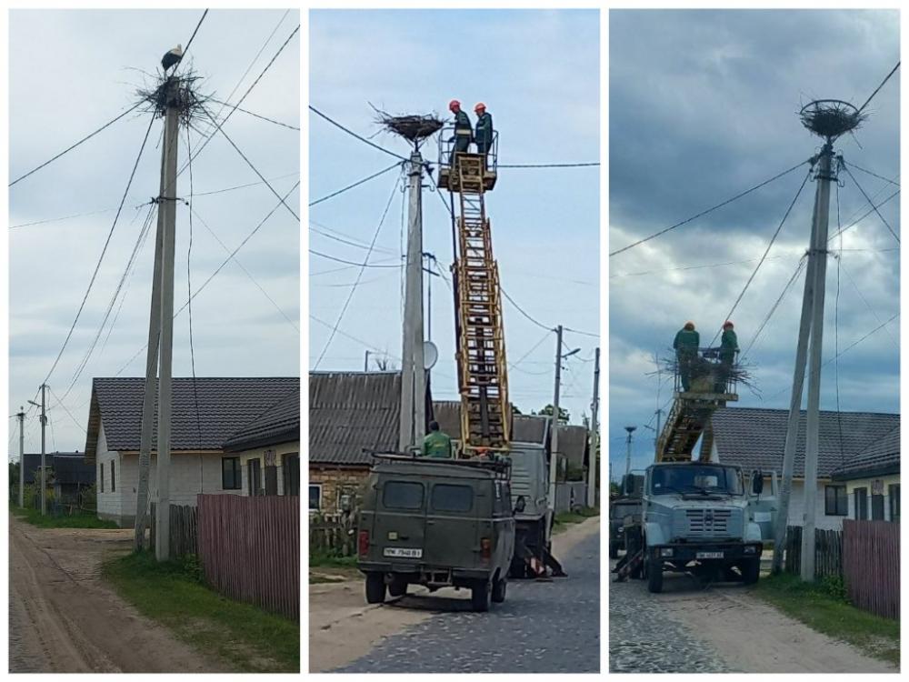 Вже за кілька днів спеціальна конструкція була встановлена працівниками Зарічненської дільниці на безпечній висоті над електромережами, в ній і оселилися молоді лелеки.
