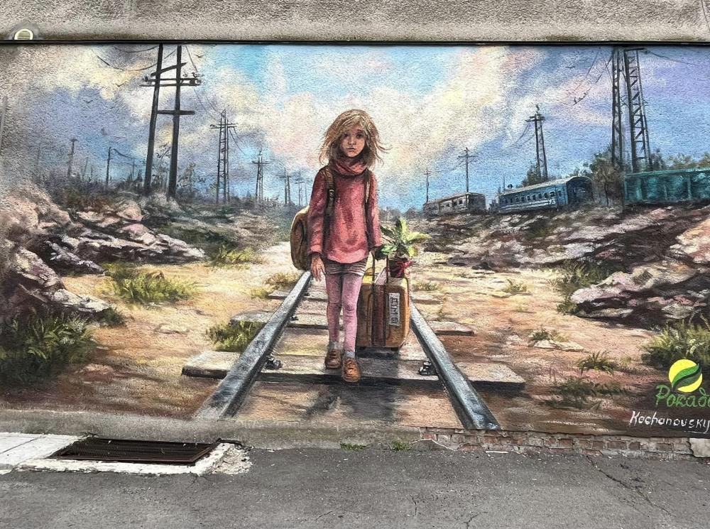 На стінописі зображена дівчинка посеред вокзалу, яка тримає в руках валізу на якій пише "дім".