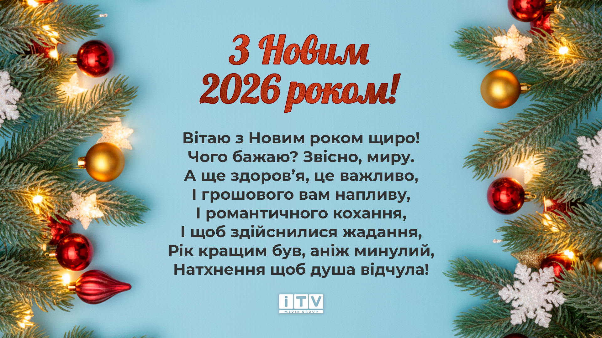 Вітаю з Новим 2026 роком! Нехай цей рік стане часом світлих змін, щирих посмішок та великих перемог. Бажаю, щоб у вашому домі завжди панували затишок і злагода, а кожен новий день приносив натхнення та віру в краще майбутнє. Нехай збудуться найзаповітніші мрії!