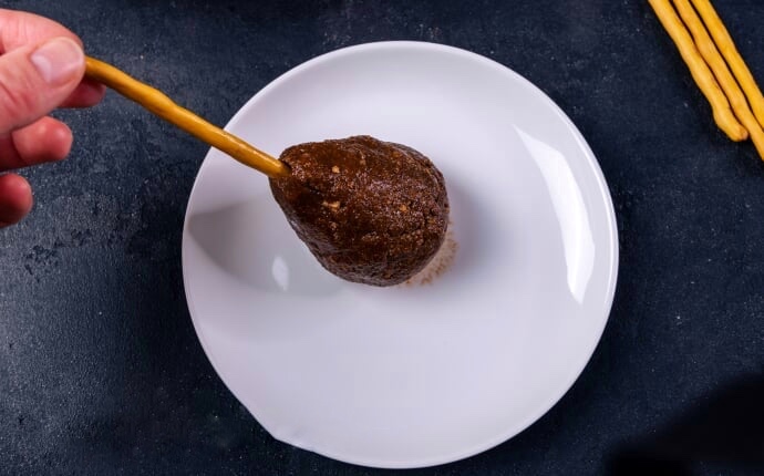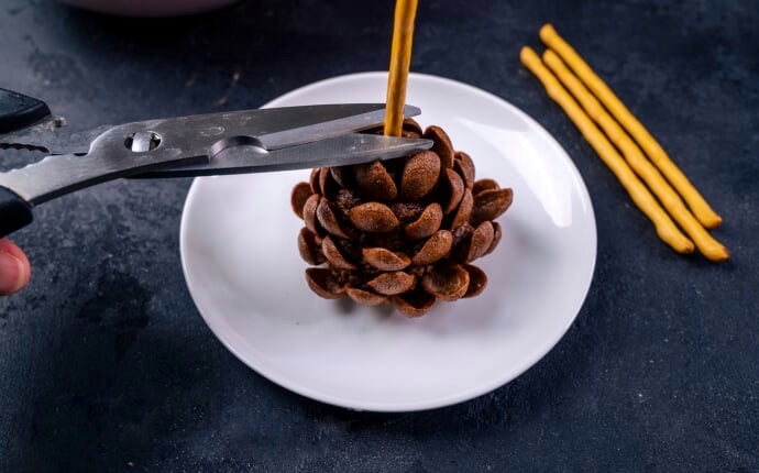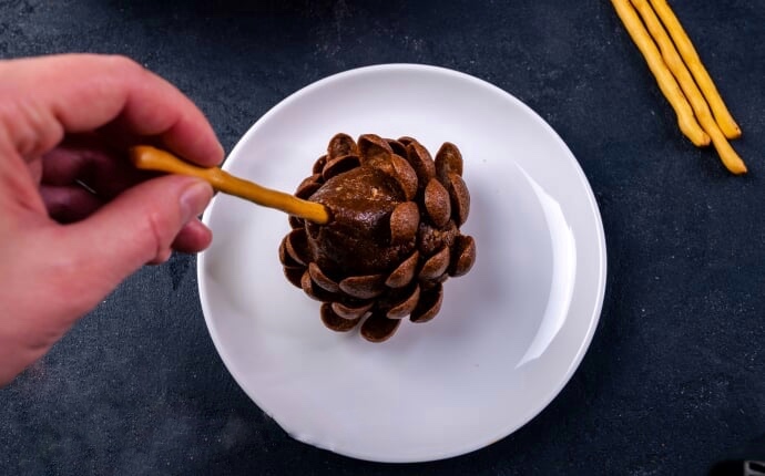 Крок 5. Починаючи з основи майбутньої шишки прикрашаємо її шоколадними кукурудзяними пластівцями. Нижній ряд найкраще формувати якомога ближче до основи, тоді солодка маса менше стикатиметься з тарілкою і десерт буде легше відліпити від неї. Якщо ви не знайшли шоколадні пластівці, то можна використовувати звичайні кукурудзяні. Для більш натурального кольору можна перемішати з какао. Ще можна прикрасити готову шишку розтопленим шоколадом. Чим більше форма пластівців схожа на хвойні луски, тим натуральніше буде виглядати десерт.