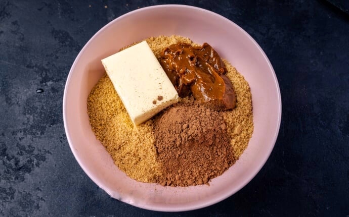 Крок 2. Додаємо до пісочної крихти розм'якшене вершкове масло (100 г), варене згущене молоко (3 ст. л.) та какао (2 ст. л.). Печиво і варене згущене молоко бувають різними, тому можна додати частину печива, перемішати масу, а вже потім дивилюся чи потрібно додавати крихту, що залишилася.