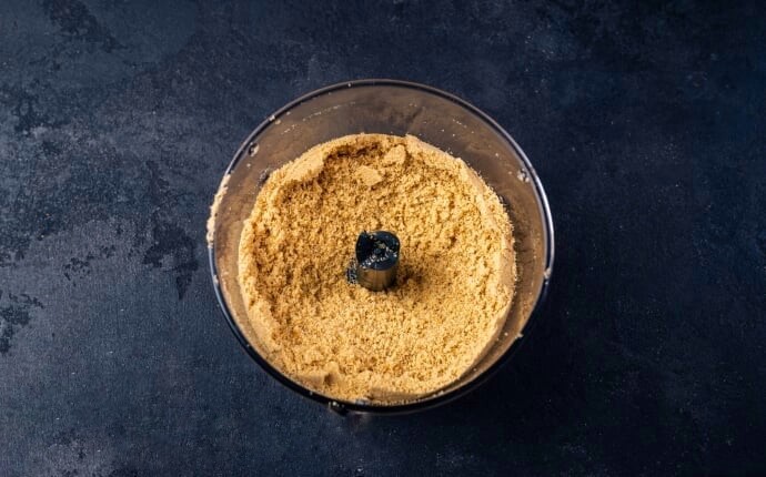 Крок 1. Пісочне печиво (250 г) складаємо у чашу блендера та подрібнюємо у дрібну крихту. Печиво можна подрібнити качалкою або пропустити через м'ясорубку. Разом із печивом можна подрібнити улюблені горіхи.