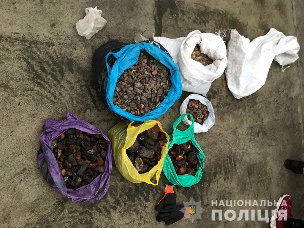 Поліцейські виявили та вилучили каміння бурштину-сирцю загальною вагою 62,9 кілограми, мотопомпу кустарного виробництва, транспортний засіб «Volkswagen Touareg», кошти в сумі 7225 доларів США, три одиниці зброї та набої до них, засоби зв’язку та чорнові записи.