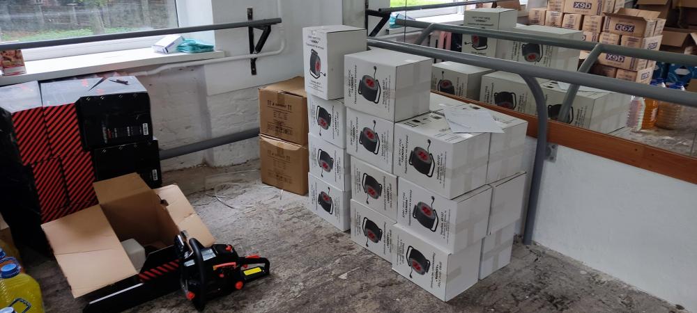 Ідеться про 4 ноутбуки з програмним забезпеченням, 2 багатофункціональних пристрої та комплектуючі одиниці, 10 бензопил, офісний папір, 20 подовжувачів на котушках, 40 мережевих фільтрів живлення, 100 вогнегасників ВП-5, мотопомпу та 5 потужних генераторів.