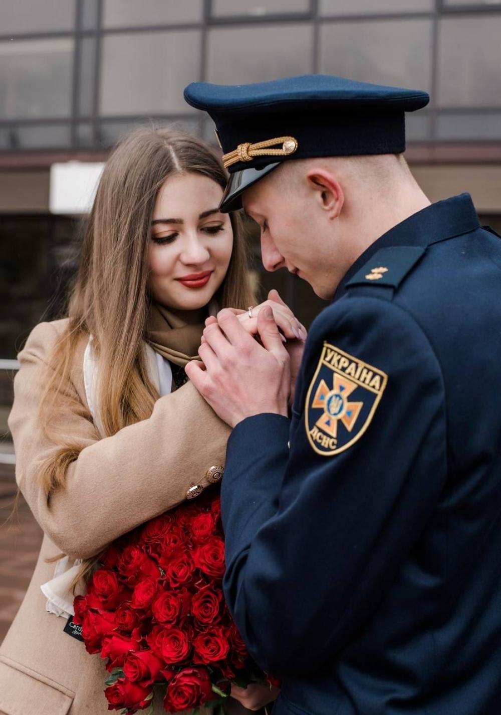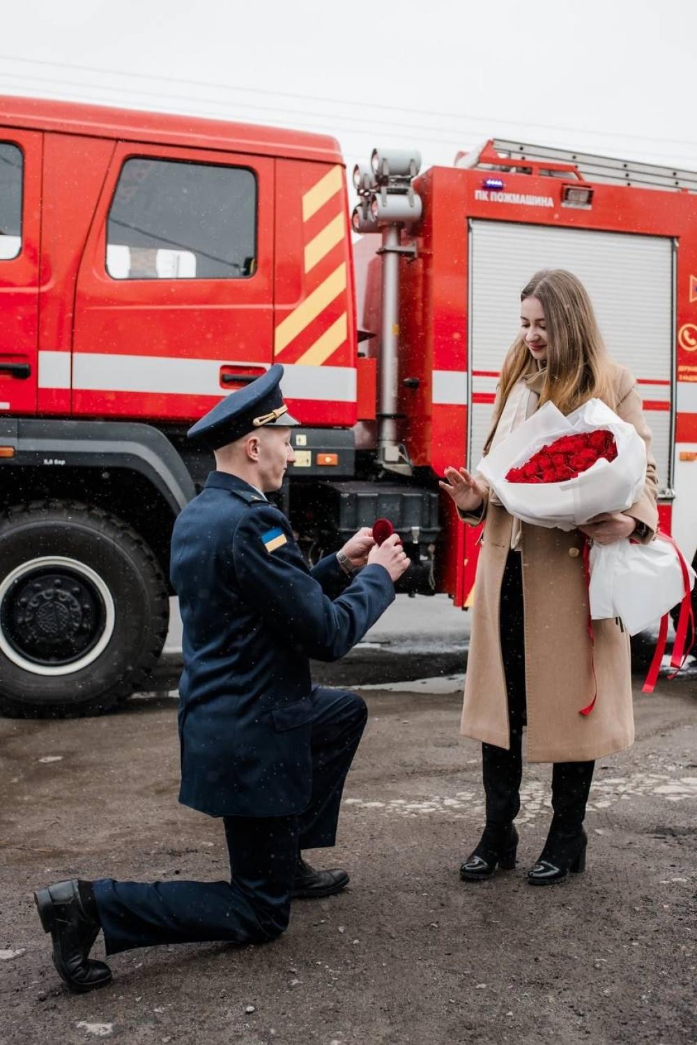 Молодий офіцер у парадному мундирі на фоні пожежно-рятувальної техніки запропонував дівчині руку та серце і, освідчившись, одягнув на безіменний палець обручку. А свідками цьому були побратими-рятувальники чергової варти, які саме несли службу.